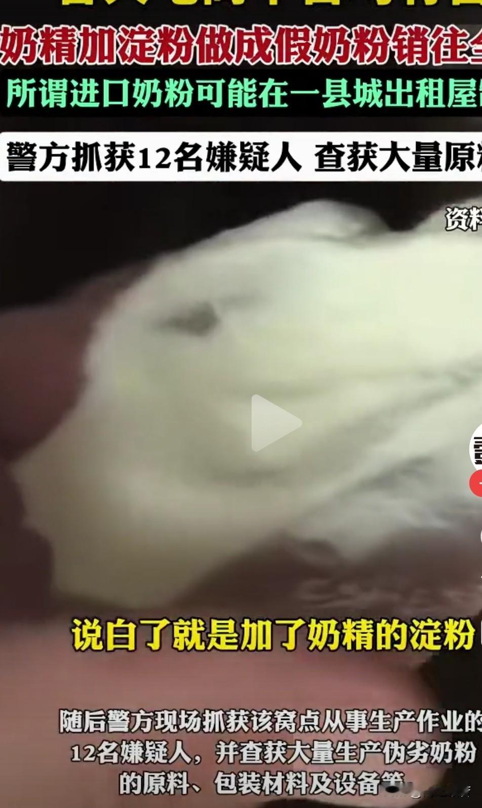 造孽!奶精加淀粉制成假奶粉销售全国? 口口声声说的是进口奶粉,却出自偏僻乡镇的黑窝点,成本低廉,在各个网络平台销售,价格几十上百,谋取暴利。 看后脊背发凉,特别是老人孩子喝上,后果不堪设想。本来是补充营养,反倒喝着毒药。想知道,它是怎么能够顺理成章地一路过关,通过网络平台销售的。 建议相关部门还要加大检查力度,工作做到实处,把制假贩假消灭在萌芽状态,食品安全关系每个人的身体健康,容不得半点马虎,应该严厉打击,绝不求饶。