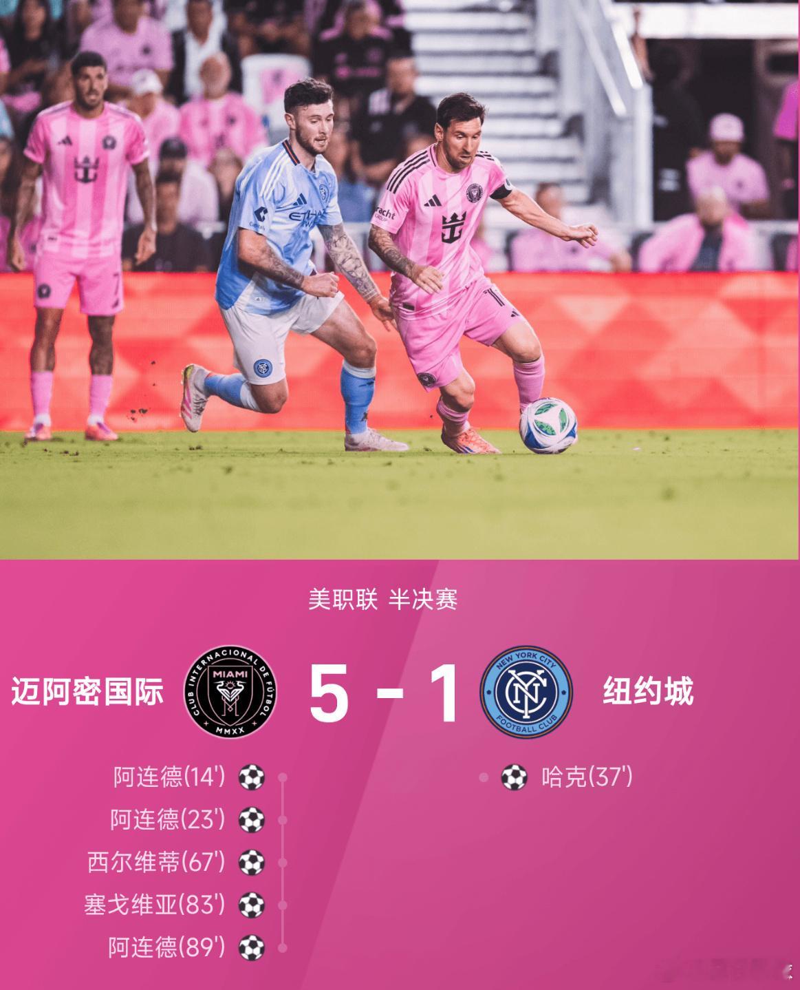 11月30日讯 25赛季美职联半决赛,迈阿密国际对阵纽约城。第14分钟,阿连德劲射破门帮助迈阿密国际取得领先。第23分钟,阿尔巴助攻阿连德甩头攻门再下一城。第37分钟,摩拉里斯主罚任意球,哈克头球破门,纽约城扳回一球以1-2落后迈阿密国际。下半场易边再战,第67分钟,梅西助攻西尔维蒂劲射破门。第83分钟,梅西策动,塞戈维亚推射破门,迈阿密国际4-1领先纽约城。比赛最后时刻,阿连德单刀挑射完成帽子戏法。最终迈阿密国际在主场以5-1大胜纽约城,挺进美职联总决赛。梅西助攻帽子戏法美职联梅西