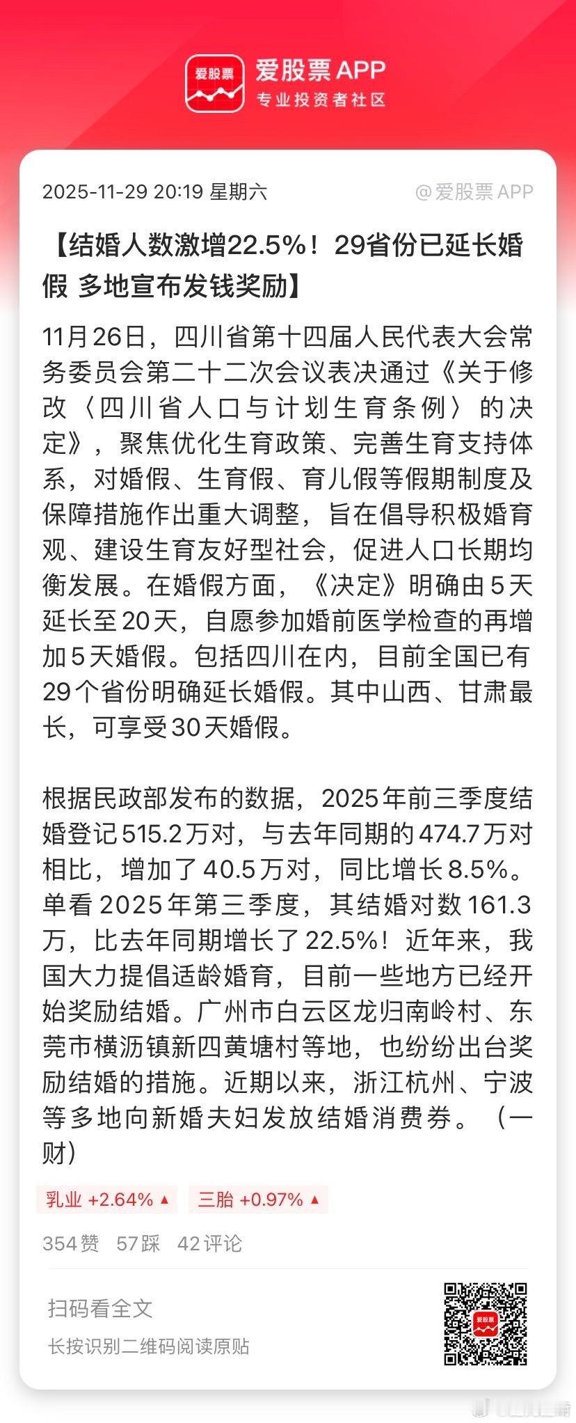 【结婚人数激增22.5%!29省份已延长婚假 多地宣布发钱奖励】11月26日,四川省第十四届人民代表大会常务委员会第二十二次会议表决通过《关于修改〈四川省人口与计划生育条例〉的决定》,聚焦优化生育政策、完善生育支持体系,对婚假、生育假、育儿假等假期制度及保障措施作出重大调整,旨在倡导积极婚育观、建设生育友好型社会,促进人口长期均衡发展。在婚假方面,《决定》明确由... 网页链接 原来是为了领钱才结的