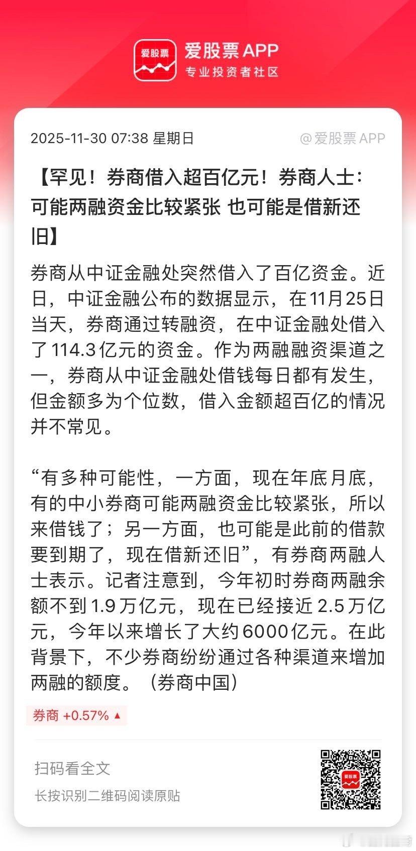 【罕见!券商借入超百亿元!券商人士:可能两融资金比较紧张也可能是借新还旧】券商