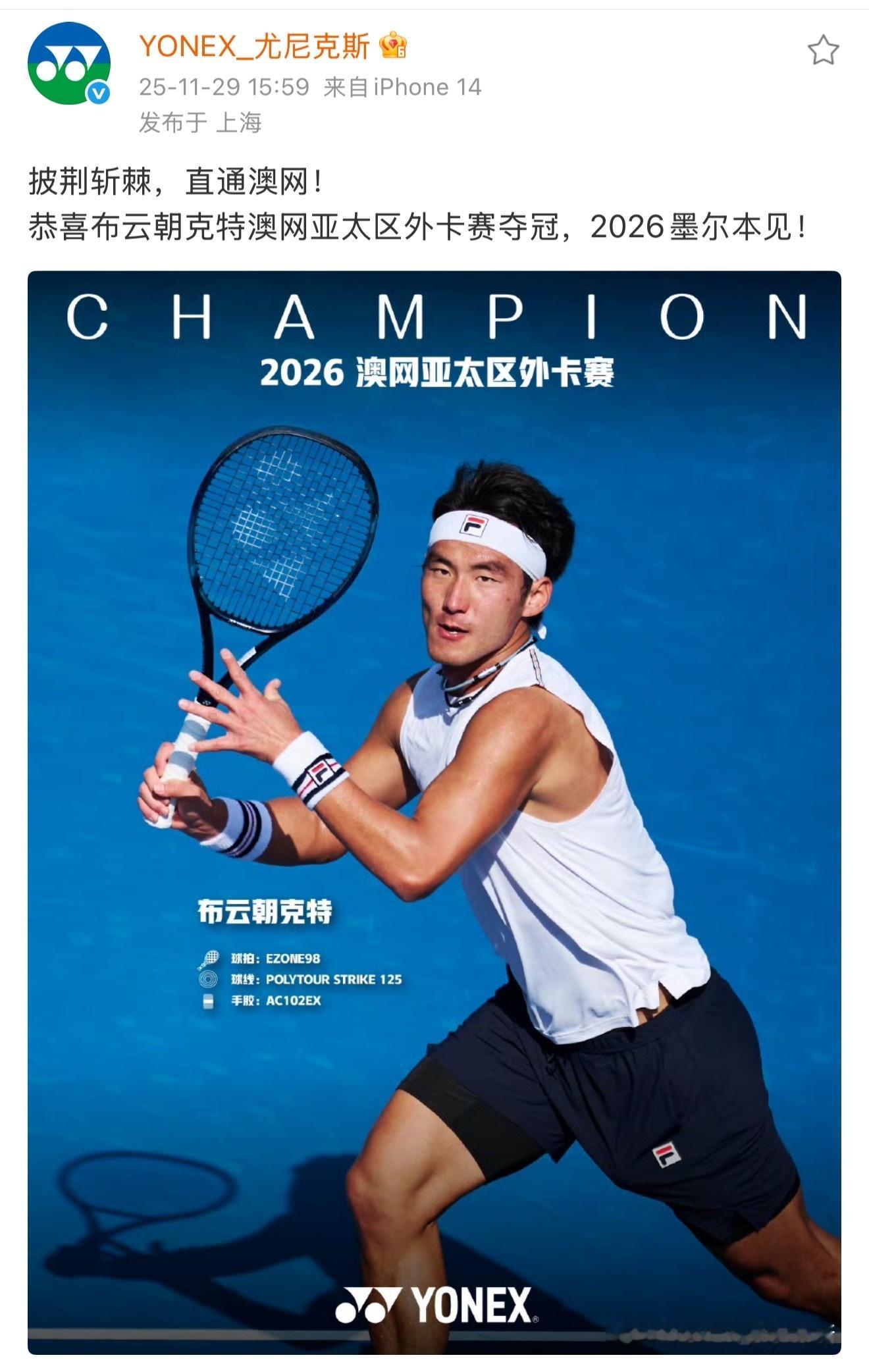 马不停蹄,从成都从澳网外卡赛深夜飞回广州,清晨将赶到澳门参加中巡赛澳门总决赛拍摄,一起盼望新的一周有许多新鲜的网球故事。在路上,留意到拍摄的布云朝克特照片上了品牌冠军海报,小布很帅气。期待和布云朝克特在澳网2026 墨尔本公园相见!也希望把更多好运气带给中国球员。海报照片来自