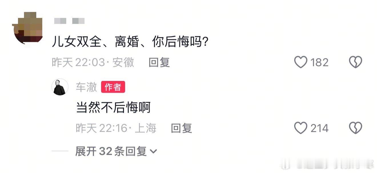 车澈称不后悔离婚车澈回复网友称时间倒回还会离婚,当然不后悔离婚,有点狠吧…车澈说时间倒回还会离婚