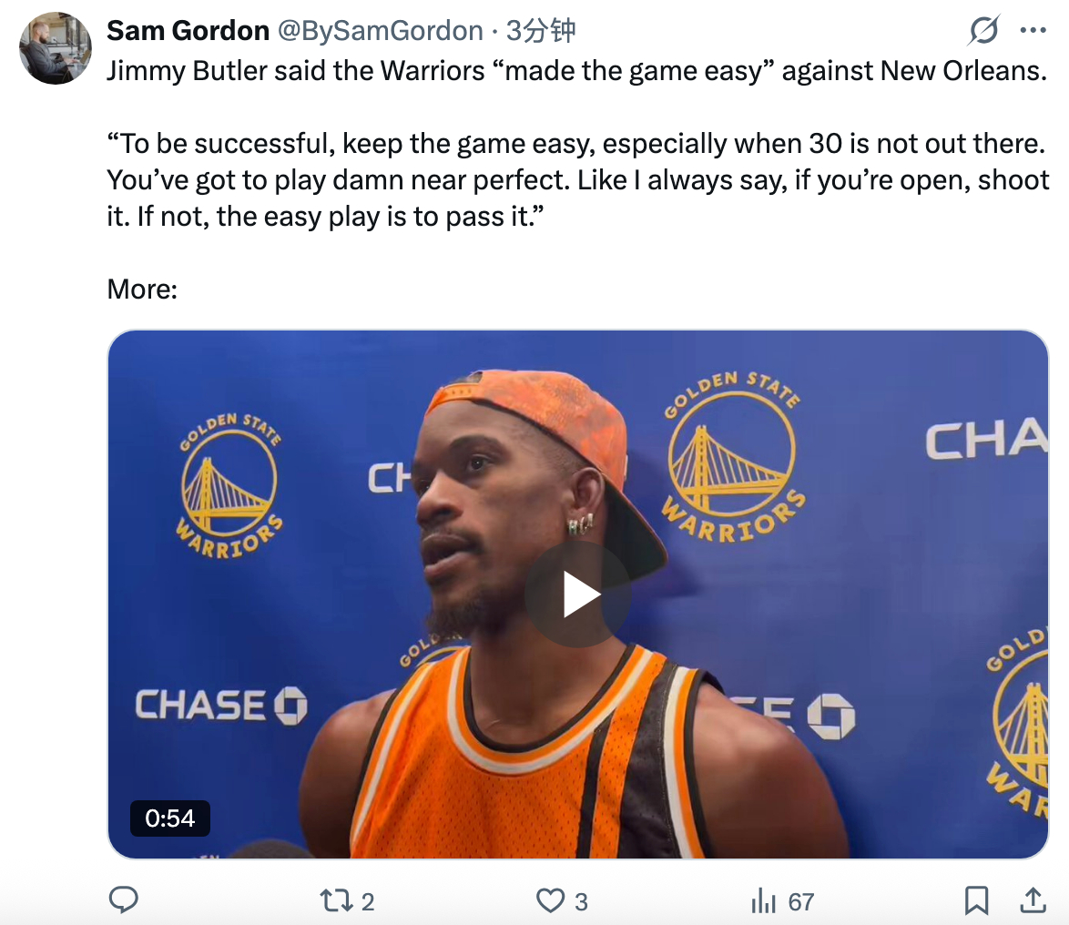 吉米·巴特勒表示,勇士队对阵新奥尔良的比赛“让比赛变得简单”。“要想取得成功,就得让比赛保持简单,尤其是在30号(库里)不在场的情况下。你必须打得几乎完美。就像我常说的,如果你处于空位,就投篮。如果不是,最简单的打法就是传球。”