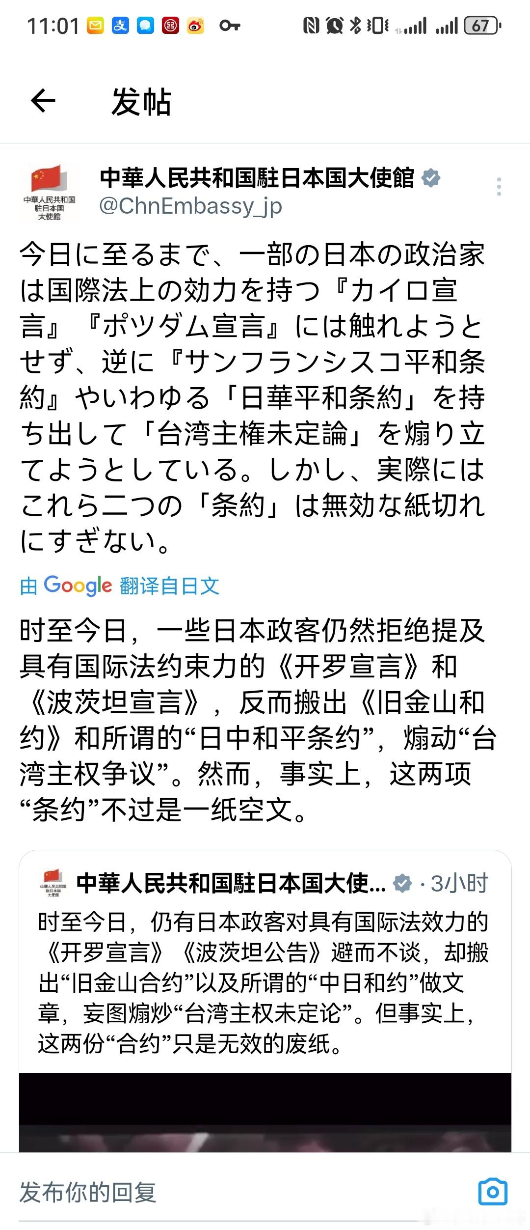 中国驻日大使馆刚刚发布一条推文:中国驻日本大使发声热点现场