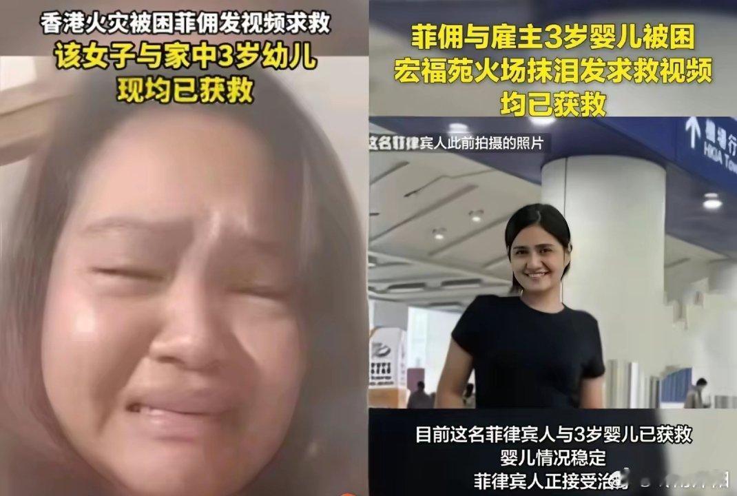 香港五级大火中的生死守护!菲佣用身体护住3月大婴儿,全网为她祈福一场席卷香港的五级大火,让一位初到当地工作的菲佣意外爆红网络,她用生命守护雇主孩子的壮举,刷屏全网令人动容。这场始于11月26日下午的五级火警,火势异常猛烈,火场温度一度超500摄氏度,短时间内波及7座大厦,棚架倒塌还堵塞了消防出入口,救援难度极大 。彼时才到香港不久的菲佣,不幸与雇主家3个月大的婴儿一同被困火海。浓烟滚滚、火光冲天的绝境中,她一边哭着给家人发视频求救,一边牢牢将婴儿护在胸前,用自己的身体和衣物为孩子筑起一道“生命屏障” 。危急时刻,香港消防处调派200多辆消防车、约100辆救护车,出动超1250名消防及救护人员全力救援。消防员在能见度极低的火场内逐层推进、逐户搜索,最终成功找到被困的菲佣和婴儿 。获救时,3个月大的婴儿在她的护佑下毫发无损,而菲佣的衣服已被大火烧烂,自己也因烧伤陷入昏迷,被紧急送进ICU抢救,生命垂危。从接过照顾孩子的职责那一刻起,这位平凡的打工人便把保护孩子的安全刻进了心里。面对危及生命的大火,她没有只顾自身逃生,而是用行动诠释了“责任”二字的重量。这份跨越身份与血缘的守护,让无数网友深受触动:“平凡的岗位,伟大的灵魂”“她用生命兑现了承诺,太让人敬佩”。目前火灾已基本扑灭,全网网友都在为这位勇敢的菲佣祈福,愿她能顺利闯过鬼门关,早日康复,让这份善良与勇敢得到幸运的回报。