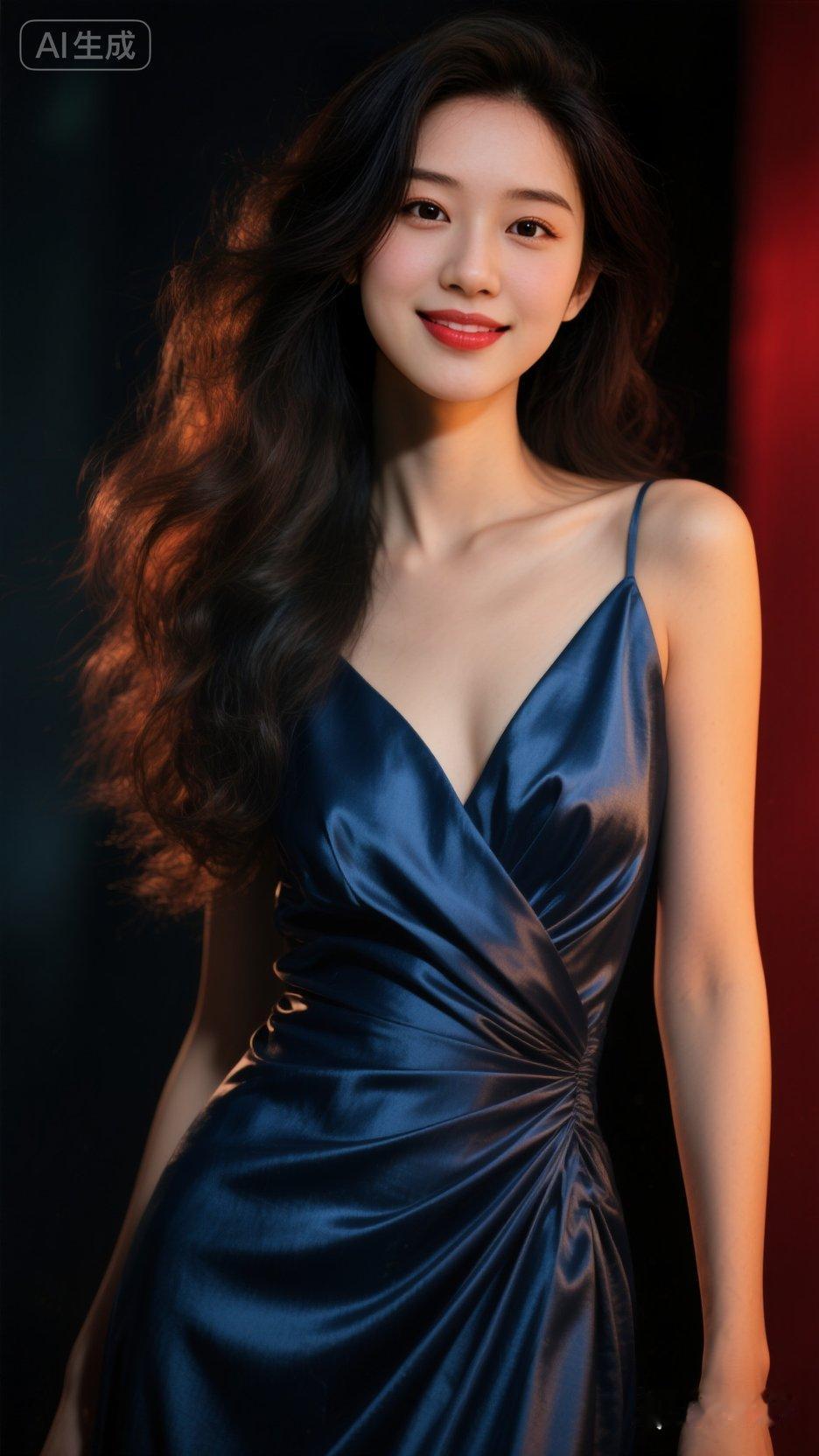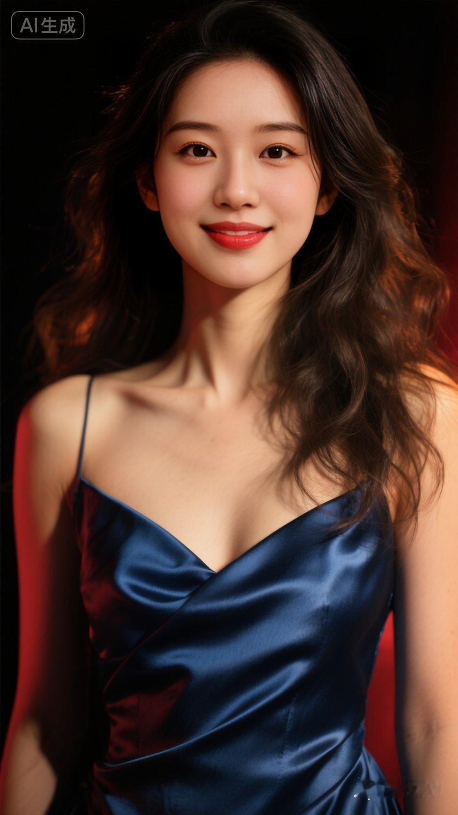 一位天生丽质、浓妆淡抹的梳蓬松长发人物着丝缎立体裁剪的礼服裙,展现出个性张扬和绝美容颜,大师杰作风格,特写,压低光线营造从黑暗中窥视世界的氛围,具有立体感、光泽感和独特有创意的光影