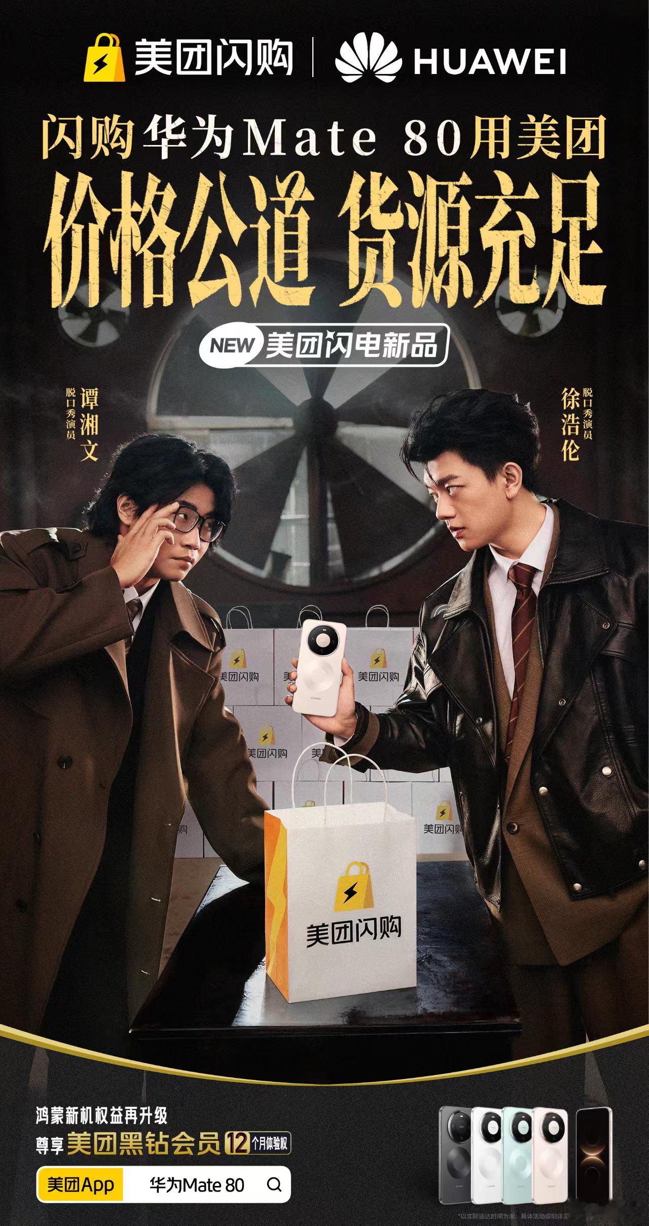 大家可以放心相信漫才兄弟的安利,,绝对之货源充足、价格公道,而且下单30分钟新机到手,还送尊享美团黑钻会员12个月体验权!买Mate80就上美团闪购美团闪购Mate80开售美团闪电新品