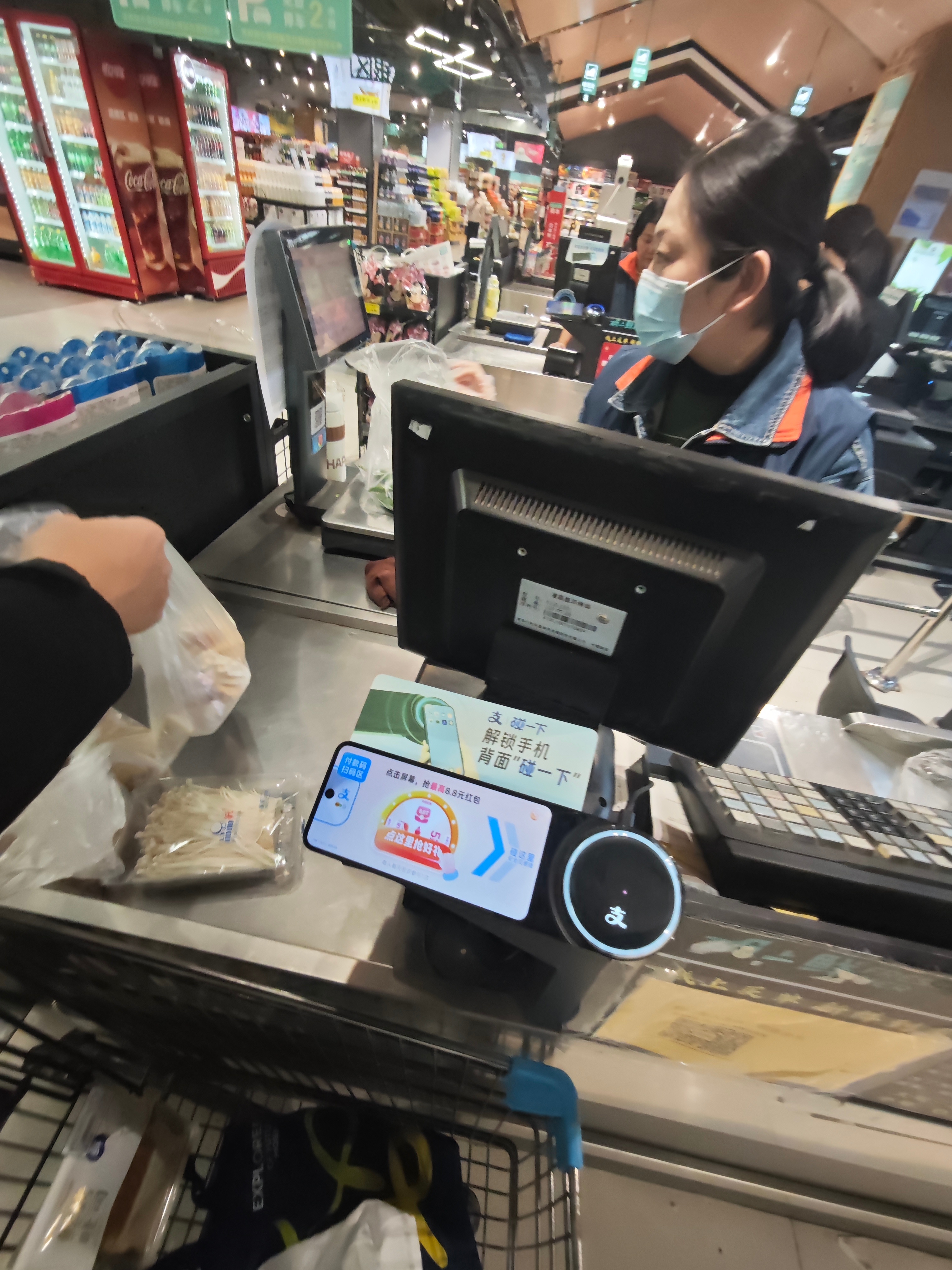 经常逛的一家超市,称菜的地方,原来的在蔬菜附近,如今变成了收银员负责。线下商超精