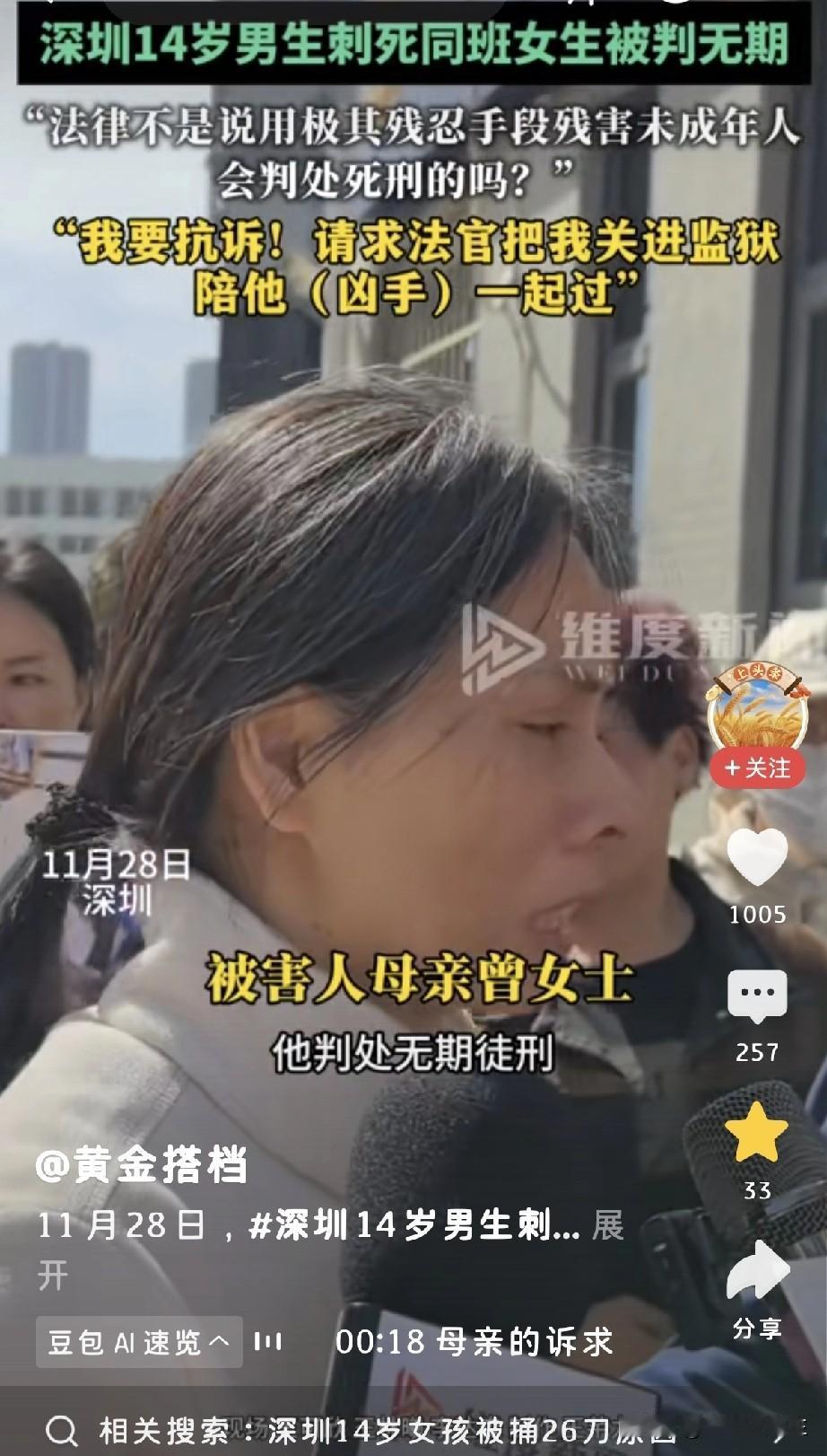 现在最不甘心的估计就是钟建川的父母了! 估计在宣判前一刻还抱着侥幸心理,自家儿子是未成年人,不会判的太重。 哪成想,判决结果出来是无期!这下钟建川的父母傻眼了。 他们估计一直以为自己的儿子14岁,属于未成年,受未成年保护法保护,最多在里面待个几年就会出来。 估计还在幻想等他儿子过几年出来,重新让他读个技校或是学个技术之类的,然后像正常人一样生活。 直到判决结果出来,判了无期。他们估计心慌了!这下心中的盘数全部落空了。 ​ 其实想想钟健川这,觉得跟他的家庭教育脱不了干系!正所谓,子不教父之过!据悉,他家有两套房子,家庭条件并不比优优家差。 然而3年时间,都是优优妈妈接送他。你说这是个什么样的家庭,能心安理得的让孩子同学妈妈风里来雨里去的免费接送3年? 到头来,没有感激,竟然还接送个白眼狼出来了。 这个小孩真是太坏了,你看他的面相,一看就是狠人!他拿着提前从网上购买的刀具,对着毫无防备的优优刺了过去。28秒的时间,他在优优身上刺了26个口子……更可恶的是,他原本都准备离开了,可听见优优微弱的呼救声后,他竟再次折返补刀。 现在好了,无期徒刑这个判决,就让他自食其果吧!虽然对于这个杀人犯钟建川来说,可能远远超出了他的预料。 可对于优优的家属来说,甚至对于我们每一个有良知的人来说,这个判决实在是太轻了,远远不够弥补优优父母所遭受的痛苦和损失! 优优走了,而这个恶魔竟然还在! 子不教父之过,钟健川的父母应该受到谴责和惩罚!