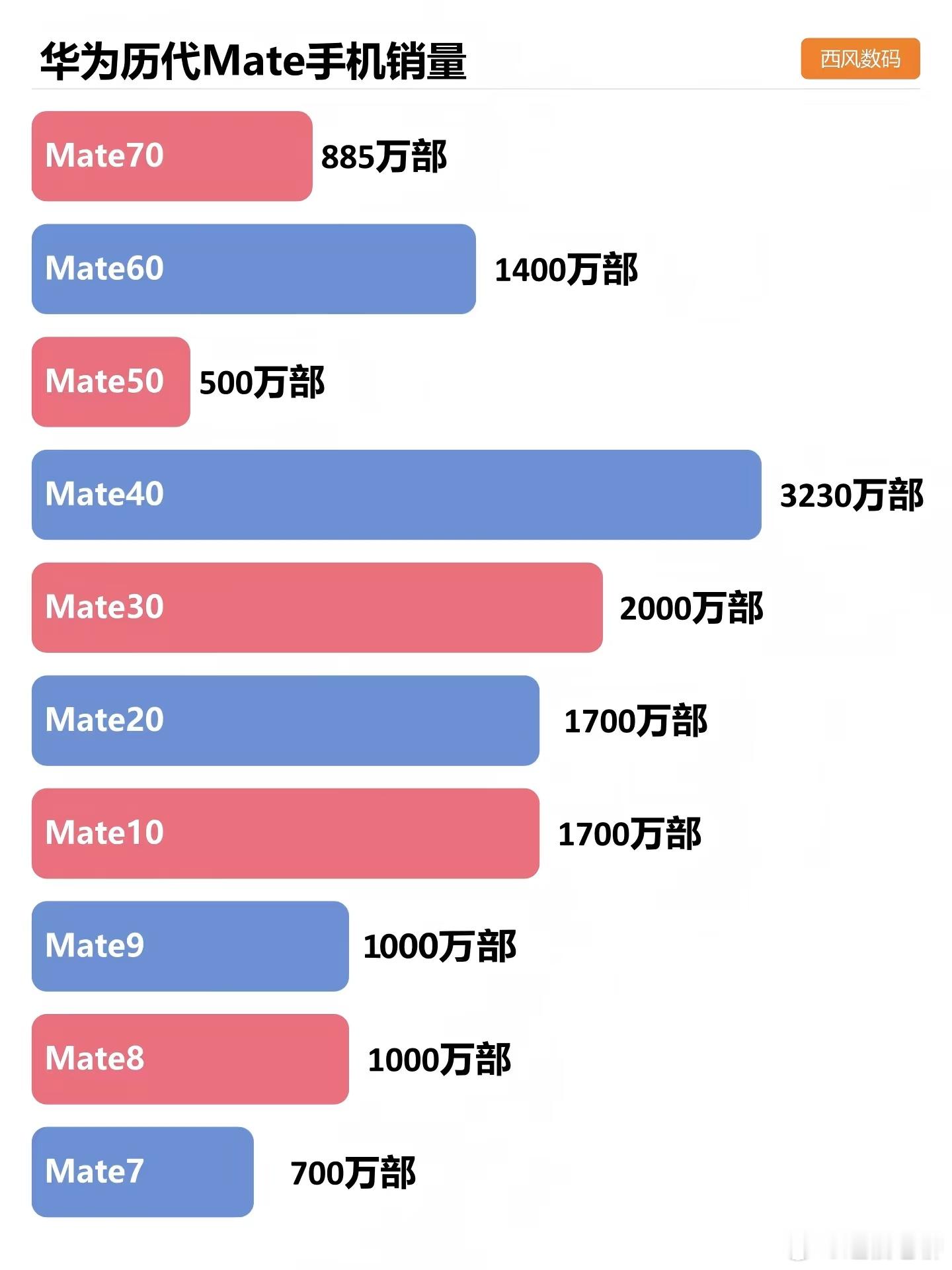 华为历代Mate系列手机的销量统计!当年真的可以和iPhone有的一拼了。(自西风数码)