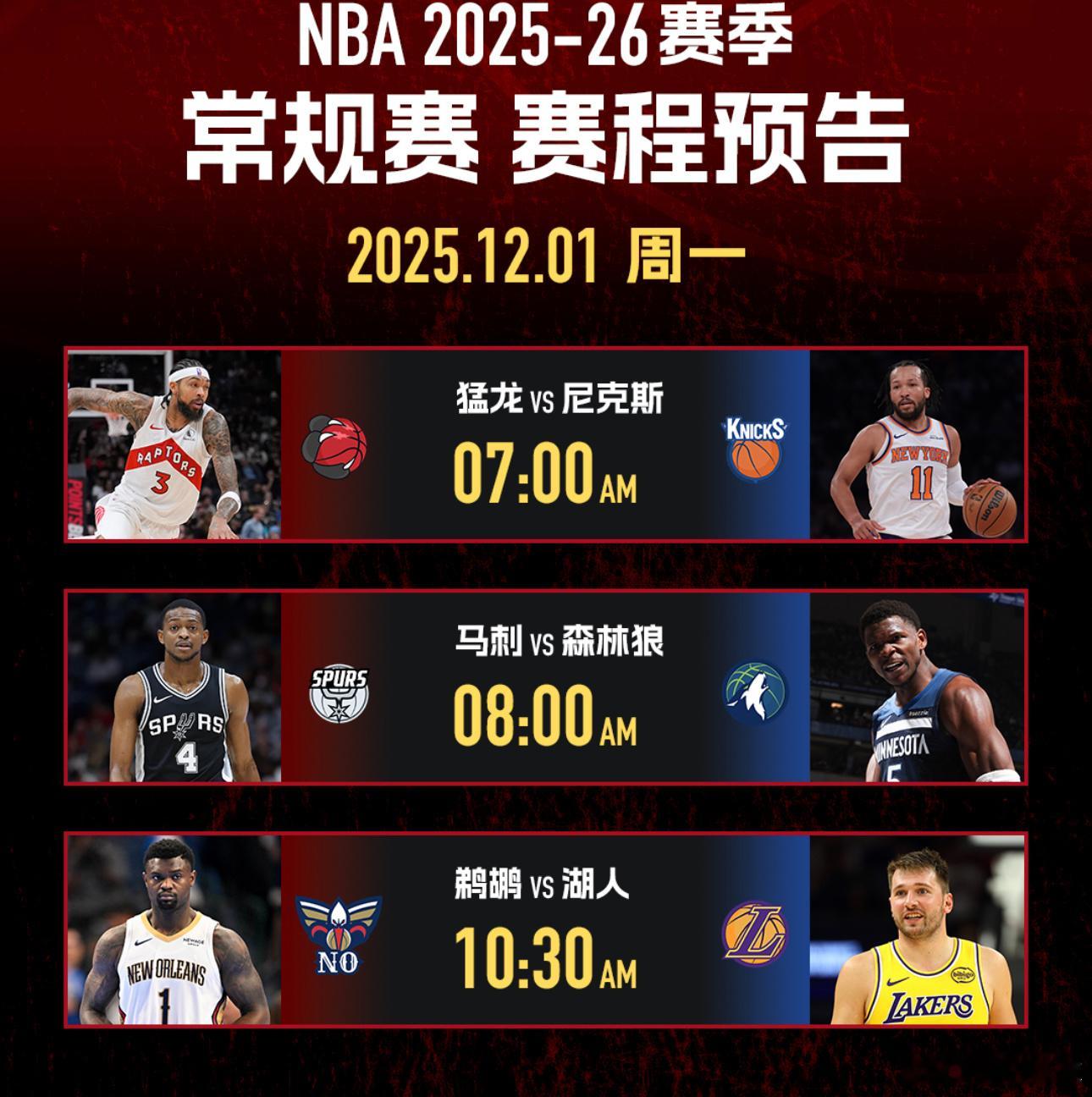 11月30日讯 明日NBA共有8场常规赛,哪些比赛最具看点呢?猛龙和尼克斯目前分别排名东部第二和第三。猛龙今天遭遇西亚卡姆绝杀无缘10连胜,如果尼克斯本场比赛获胜那么会把两队胜场差缩小到0.5场。英格拉姆+巴恩斯PK布伦森+唐斯,你觉得哪队能赢?马刺vs森林狼目前马刺和森林狼分列西部第五和第六。在文班亚马伤停后,马刺的战绩并没有下滑,反而是拿下了5胜1负,福克斯带领球队打出了团队篮球。森林狼今天依靠着爱德华兹的39分和一记关键三分,成功击败凯尔特人。两队过去的3次交手,森林狼保持全胜,明天他们能继续赢球吗?鹈鹕vs湖人鹈鹕的近况只能用一个“惨”字形容,目前3胜17负排名西部垫底。而湖人则是轰出一波6连胜,排名高居西部第二。明天詹姆斯由于左脚受伤出战成疑,如果他无法出战,那么里弗斯和东契奇需要有更好的发挥。两队过去的10次交手,湖人9胜1负拥有极大优势。锡安率领的鹈鹕背靠背挑战湖人,能否爆冷获胜呢?NBA猛龙vs尼克斯NBA常规赛