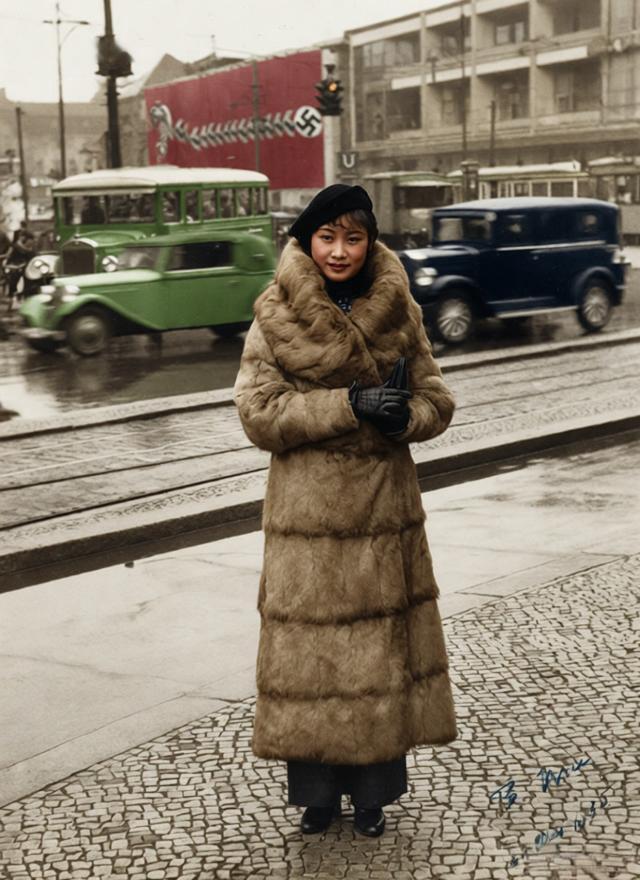 这是1935年中国早期影坛巨星胡蝶在德国柏林街头的留影,她是中国影史首位“电影皇后”。 画面里的胡蝶身着长款华贵毛皮大衣,搭配精致帽饰与手套,脚下是柏林街头的鹅卵石路面,身后的电车、老式轿车是彼时柏林的城市标配,而醒目的纳粹卐字标志,则是1935年纳粹德国统治下的时代符号,这张照片既是她个人的时尚定格,也无意中留存了当时德国的时代印记。