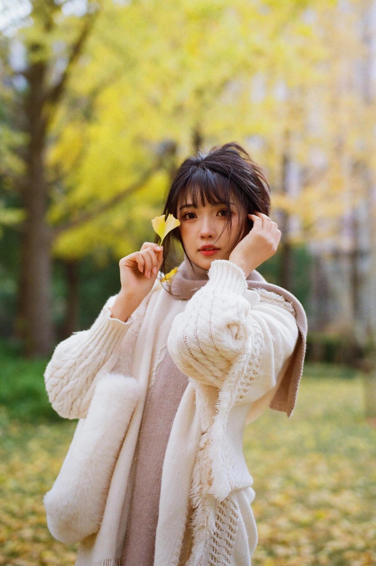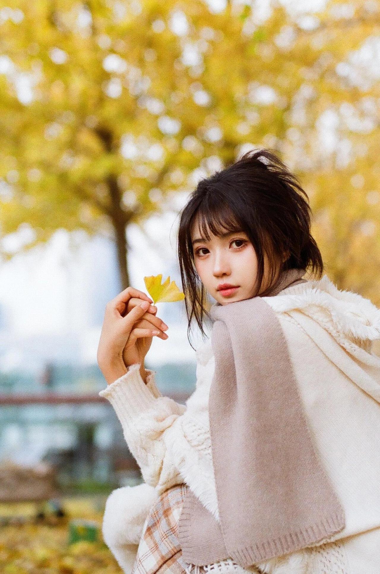 秋日暖阳下,少女轻抚落叶,温柔如画。
