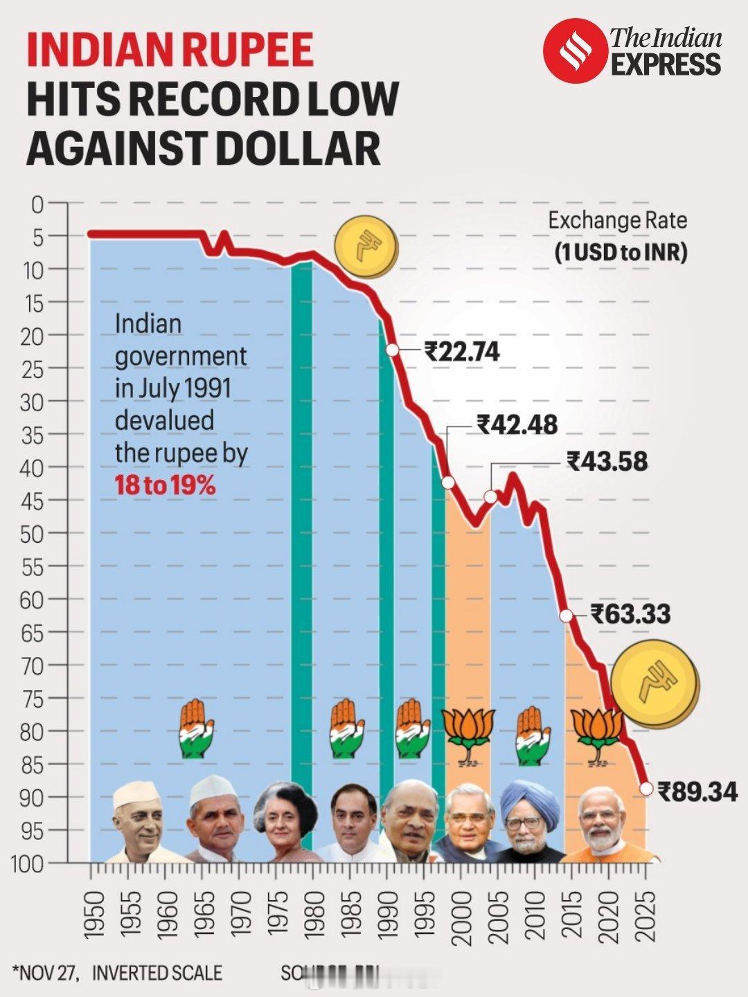11月27日,卢比兑美元汇率跌至历史新低,延 续了自独立后最初几十年开始的长期下跌趋 势, 并在1991年贬值后急剧加速。