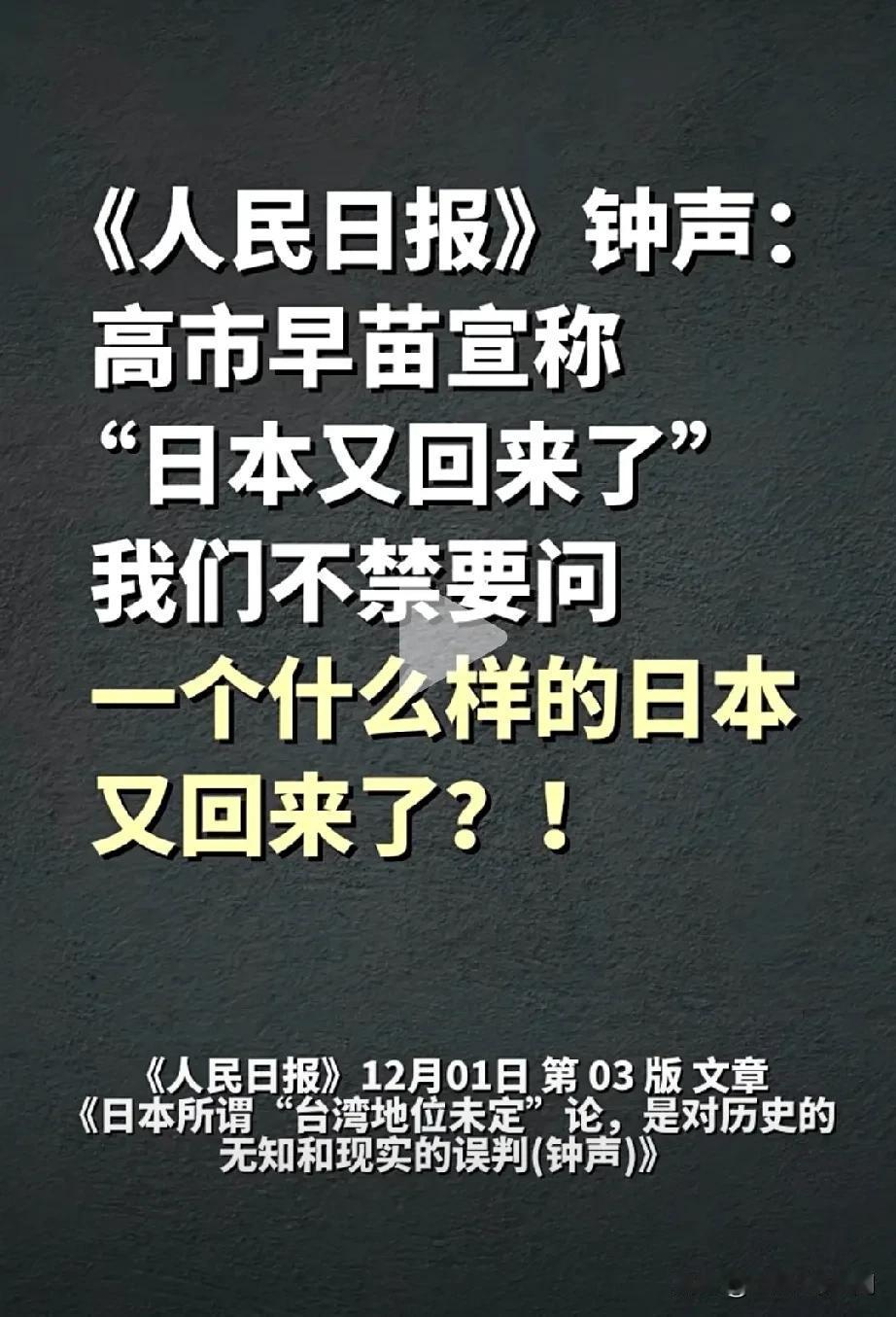 这句话分量极重! 高市早苗11月30日,公开叫嚣: “日本又回来了!” 死不认账、死不改悔的日本军国主义余毒高市早苗此话侵略气味浓重、气氛狂热、杀气腾腾…… 不仅要公开武力犯台,而且要公开重振侵华日军之前的所有罪孽。 现在几乎可以说必有一战!