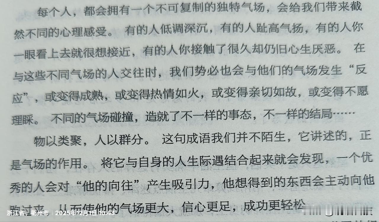 物以类聚,人以群分。 这句成语我们并不陌生,它讲述的,正 是气场的作用。 将它与自身的人生际遇结合起来就会发现,一个优秀的人会对“他的向往”产生吸引力,他想得到的东西会主动向他跑过来,从而使他的气场更大,信心更足,成功更轻松。人际法则 人际吸引定律
