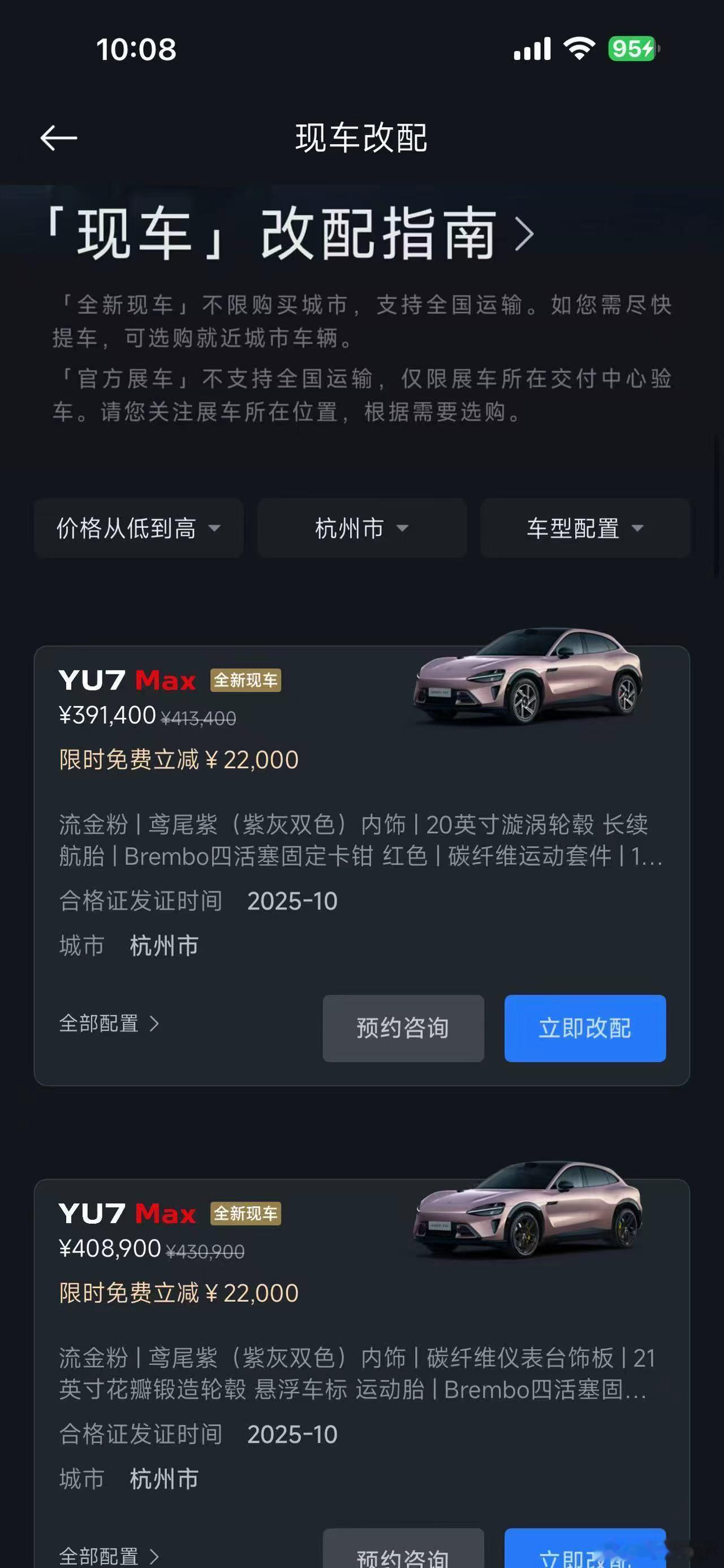 小米汽车正式开启现车选购通道!已锁单没交付的都可以改配,有全新现车、官方展车、准新车/运损车可以选。我个人更推荐这种,一些小刮擦或者小库存没啥大事但能省个万把两万块钱,这不香吗很多品牌都有这种新车,但销售很少会主动推,因为有些利润比较低而且要调车,所以大家在买新车的时候也可以多问问。新能源汽车小米汽车