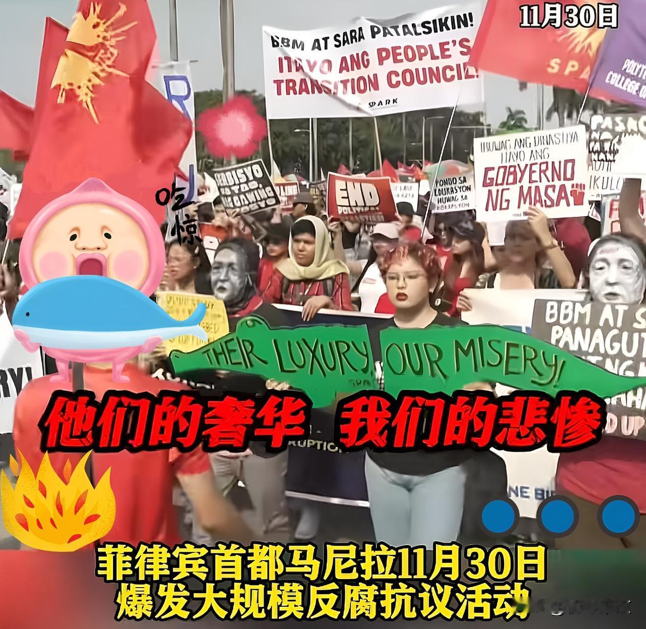 菲律宾传来消息 11月29日,中国驻菲律宾大使馆发布紧急通知,提醒在当地的公民加强安全防范,非必要不外出。原因是11月30日菲律宾全国将会爆发大规模抗议活动,民众走上街头,举着标语、头戴鳄鱼面具喊着“现在就把腐败官员关进监狱!”等口号,要求惩罚腐败分子,部分抗议者呼吁总统马科斯下台。 抗议活动核心起因是马科斯当局的“幽灵防洪工程”,这是一项耗资5450亿比索(约90亿美元)的虚假防洪项目。马科斯当局曾声称资金用于数千个防洪相关项目,部分项目以资金不足为由未完成,但调查发现,大量项目根本不存在,涉案资金被中饱私囊。 此前民众对马科斯政府的施政已有不满,如今“幽灵防洪工程”丑闻的曝光,让不满情绪彻底爆发。警方严阵以待,在马尼拉、克拉克、宿务等地部署超1.7万名警员,设置路障,防止抗议活动影响交通与公共秩序。 目前,马科斯执政一年多,民众的愤怒和绝望情绪不断加剧,本次抗议活动实际参与人数超组织者最初预估的12万人,抗议队伍持续壮大。前众议员扎尔迪·许等人指出,马科斯执政以来,物价飞涨、工资增长停滞、就业机会不足,且其本人被指收取巨额回扣,导致民生困境加剧。 马科斯针对相关指控回应称:“既然他有本事在国外发表演讲,就应该有本事回国作证。” 腐败问题已让民众的忍耐达到极限,一场风暴或将撼动马科斯家族的统治根基。 权力需阳光,缺乏监督让公共项目成腐败温床,唯有公开问责,才能守住公共资金,筑牢政府与民众的信任。菲律宾这场大规模抗议,说到底是民众对腐败的忍无可忍。本用来抵御台风的防洪资金,变成少数人的“提款机”,再加上物价飞涨、就业难的民生困境,不满自然集中爆发。 这也提醒我们,民生和信任才是政权的根本。政府花的每一分钱都该用在刀刃上,公开透明才不会让“民生工程”变“幽灵工程”。不管哪个国家,漠视民众利益、放任腐败滋生,最终只会引火烧身,再强硬的应对也挡不住民众对公平正义的诉求。