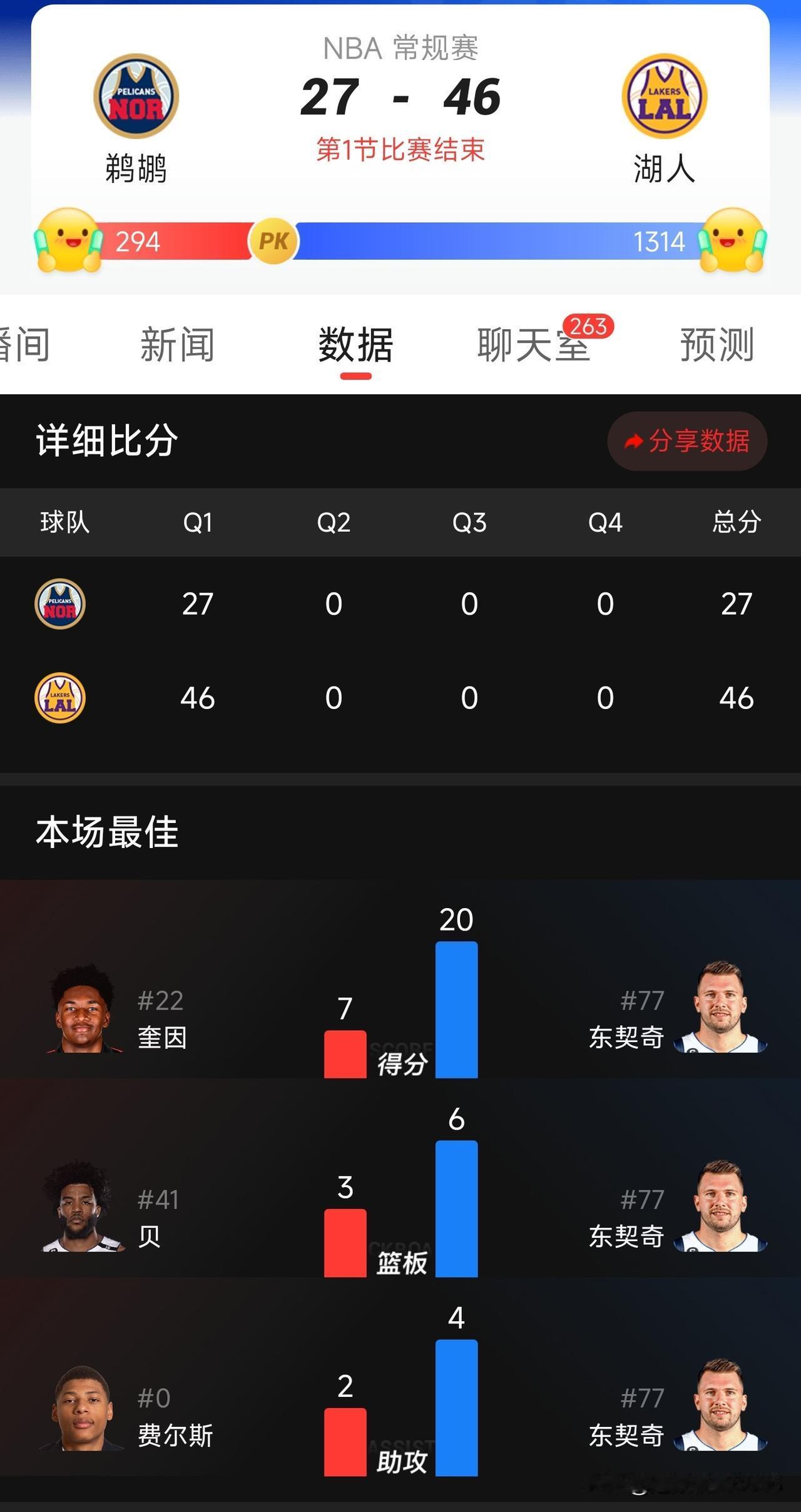 詹姆斯缺阵,东契奇首节狂砍20分6板4助,湖人46:27领先鹈鹕19分。 不出意外,湖人又会大比分拿下鹈鹕喜迎七连胜,稳居西部第二,唯一疑问就是东子今日能否砍下40+的大号三双了。