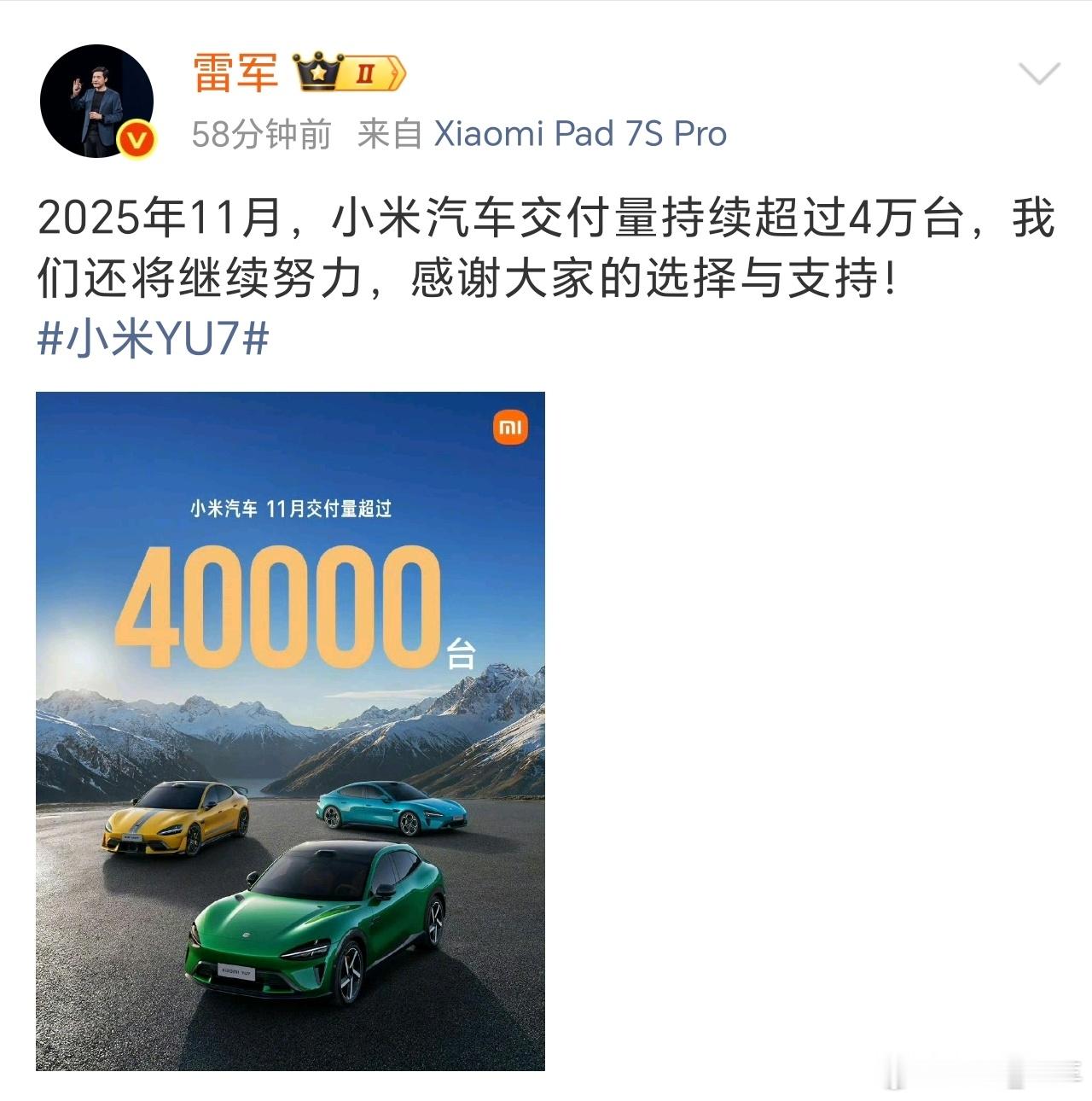 12月1日小米汽车公布11月交付量再超4万台,交付势头稳健。雷军回应将继续努力,感谢用户支持~此前第50万辆整车顺利下线,不足20个月达成此里程碑,刷新行业纪录。