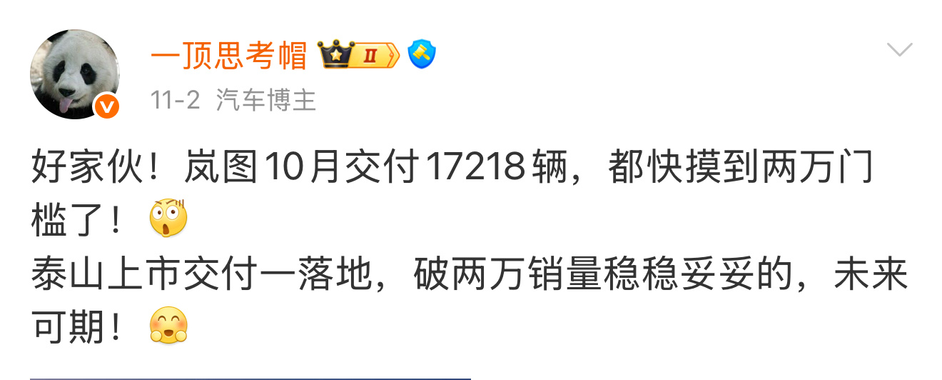 我一直非常看好岚图的发展潜力,此前就明确预判过,随着产品布局的完善,销量必将迎来突破性增长,如今这份判断终于得到了扎实的数据印证。(图二)2025年11月,岚图正式交出月交付20005辆的成绩单,不仅首次突破两万辆大关,还实现连续10个月环比增长,当月同比涨幅更是达到84%;拉长时间维度看,1-11月累计交付量同比增长82%,而品牌从20万辆产能到30万辆的跨越仅用了7个月,成为首个达成30万辆规模的央国企高端新能源品牌。