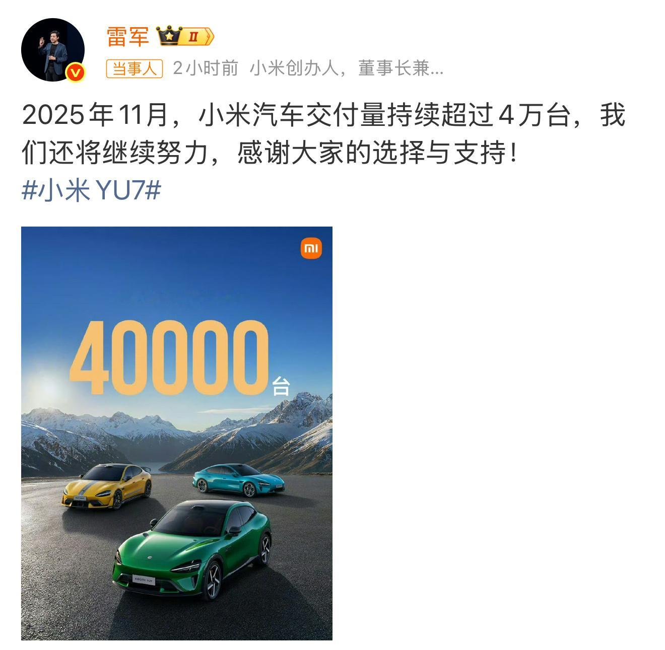 雷军已确认:小米汽车11月交付量持续超过4万台!具体多少目前不得而知,需要12月10日第三方平台更新数据。雷军回应小米汽车11月交付量超4万台
