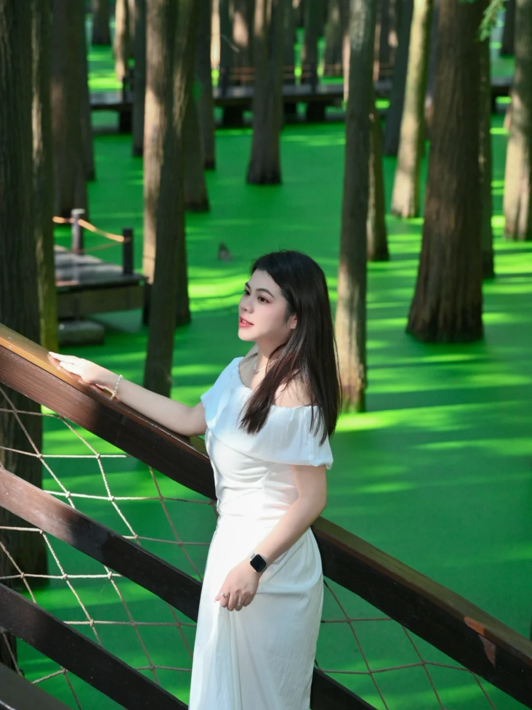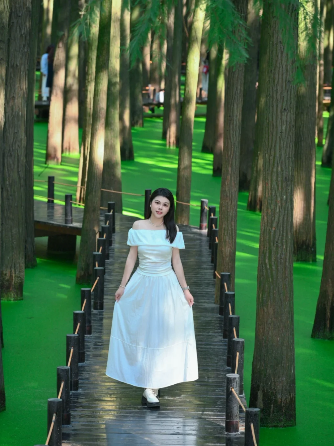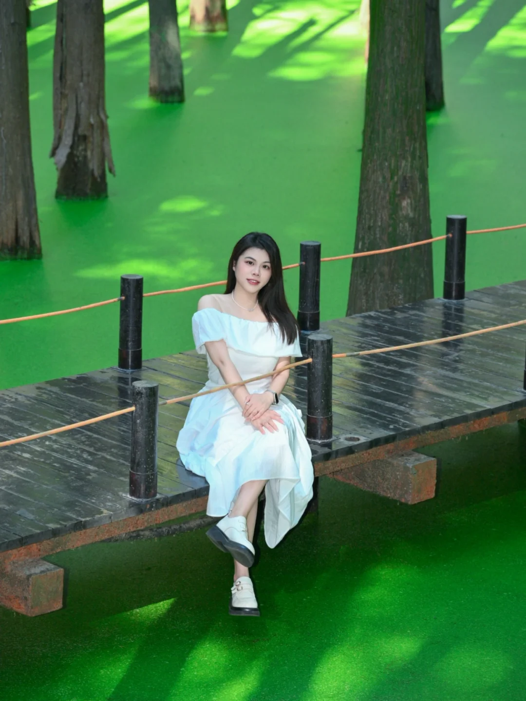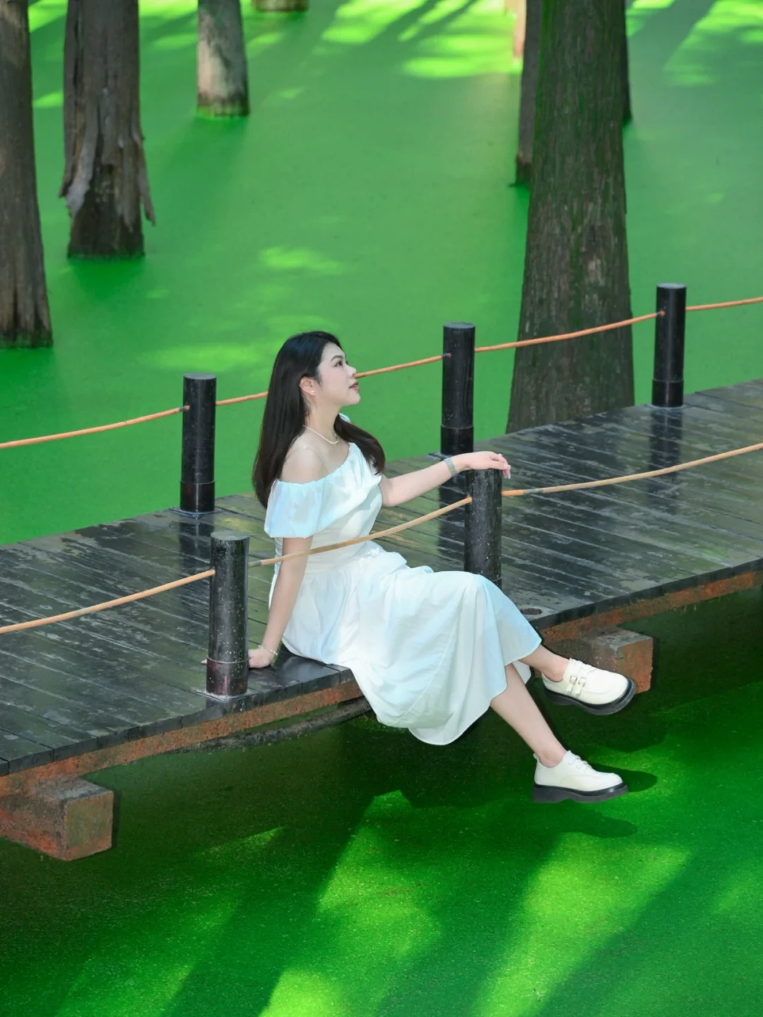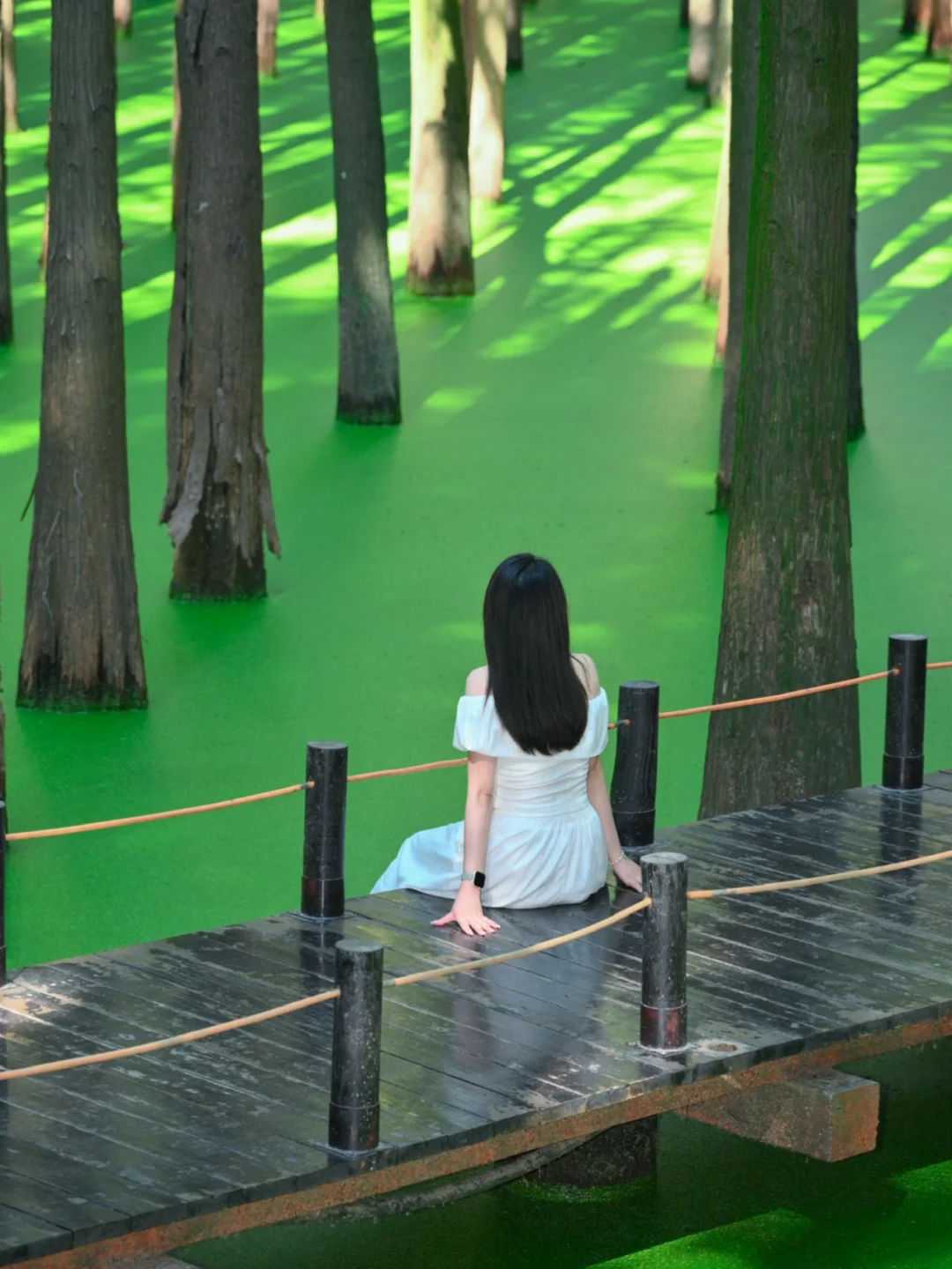 杭州青山湖水上森林,简直美到失语!🍃 抹茶绿的水面像是大自然打翻的颜料盘🎨 漫步森林,大口吸氧,吸收满满的绿色能量🔋 🌳青山湖水上森林游玩攻略快码住: 🎫门票:40r/人(1.2m以下儿童免费) 杭州文旅卡💰29.9r/人,需提前两小时购买 (限杭州本地或社保缴纳在杭州的) 🈺开放时间:8:00-17:00(16:30停止入园) 🚇交通:16号线【青山湖站】D口 🚌地铁口有1元景区接驳车,如果没有,步行至水上森林入口10分钟左右 📍自驾:🧭导航“青山湖水上森林停车场”(青山湖D口旁),💰5r/h 🚣景区皮划艇:单人💰120r/h,双人💰220r/h 👗穿搭建议:穿黑色或白色等纯色系,露肤度较高的衣服,可以搭配帽子、墨镜、首饰等,拍照更出片。 📷网红机位在景区东区“亲水平台”,有水边栈道可以坐着或站着拍照,很出片!⚠️那边有很多摄影师,可现场约拍,大多20元/张,包修。 ⚠️Tips: 1、尽量工作日10点前或者周末9点前入园,错开高 峰; 2、拍照建议早上或下午2点后去,光线柔和更出片; 3、森林水域蚊虫较多,做好驱蚊防蚊; 4、水边拍照和玩皮划艇要注意安全; 5、景区有黑天鹅🦢、野鸭子🦆、小鹿🦌,随缘碰到; 6、景区物价不算贵且统一,农夫山泉4元/瓶。