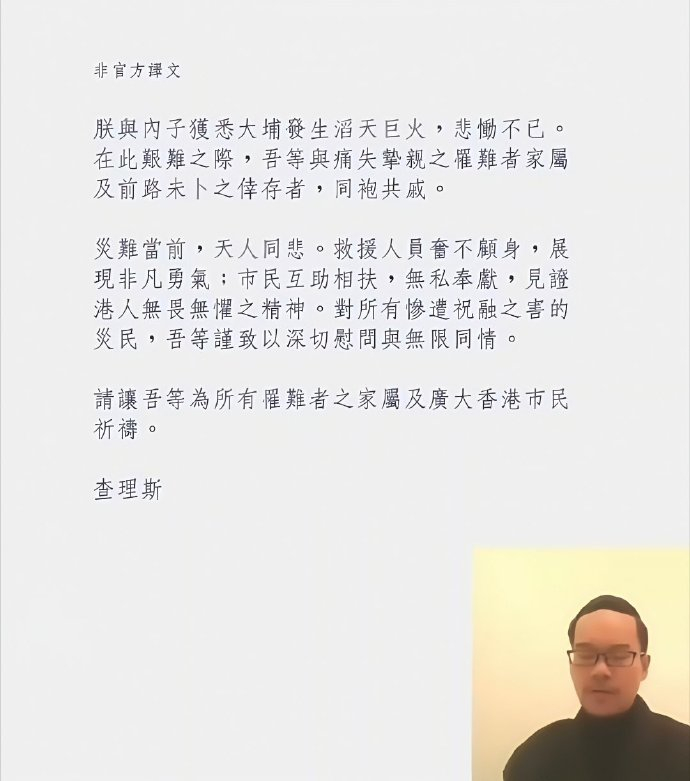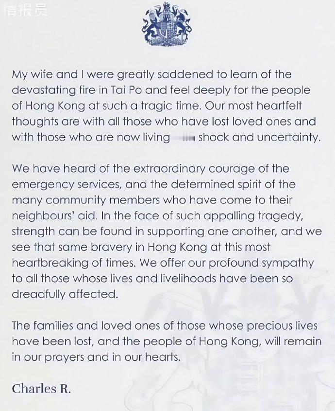 查尔斯发了一份电子信慰问香港火灾,一个香港人专门感激涕零地翻译成了中文。