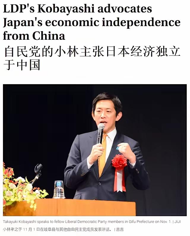 不自量力,小林鹰之竟然宣称日本应该与中国脱钩。 11月30日,日本自民党政调会长小林鹰之又出来表态,他一边说高市涉台的错话和日本政府以前立场一致,绝不撤回,一边还喊着日本要搞“独立于中国”的经济,什么叫独立于中国的经济,说白了就是要与中国脱钩。 与中国脱钩,日本有那个实力吗? 实际上,日本经济早就离不开中国了。日本家电,九成以上都来自中国;日本农民种庄稼用的化肥,原料也大多靠中国供。更关键的是,日本汽车、手机这些核心产业用到的稀土,几乎全靠中国供应,连提炼技术都得找中国;还有不少汽车、电子零件,只有中国能造,日本工厂没了这些零件,生产线立马就得停。 别的不说,中国要是切断稀土供应,对日本就是毁灭性打击。日本丰田、日产等车企的新能源车型生产线会迅速停摆,半导体企业也会因缺原料陷入瘫痪,替代材料要么性能不达标,要么成本极高。这不仅会让相关企业巨额亏损、大量裁员,还会冲击日本出口体系,导致GDP下滑,引发物价上涨等连锁反应,对其经济造成难以承受的打击。 日本要作死,谁也挡不住。