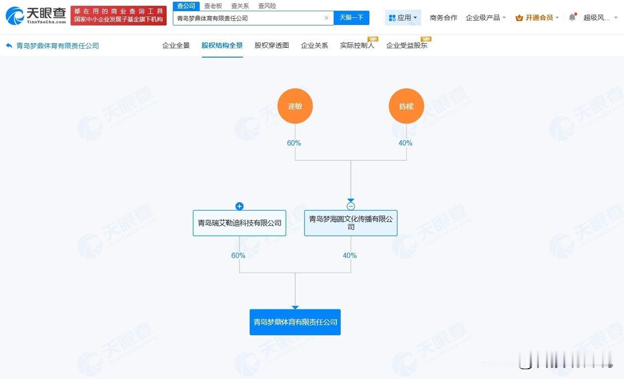 【陈梦父母投资成立体育公司 陈梦父母新公司叫梦鼎体育】 天眼查工商信息显示,近日,青岛梦鼎体育有限责任公司成立,法定代表人为王鹏,注册资本10万人民币,经营范围包括体育竞赛组织、体育用品及器材批发、体育经纪人服务、组织体育表演活动等。股权全景穿透图显示,该公司由青岛瑞艾勒迪科技有限公司和青岛梦海圆文化传播有限公司分别持股60%、40%,后者由逄敏(陈梦母亲)、陈樑(陈梦父亲)共同持股。 天眼查信息: