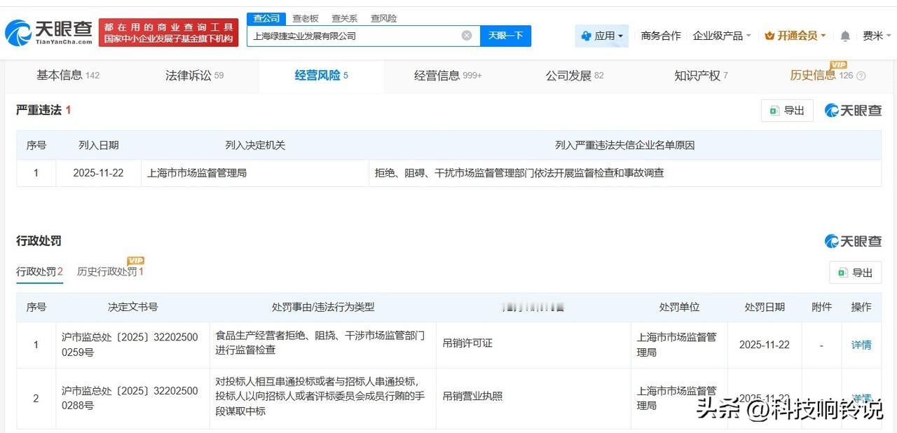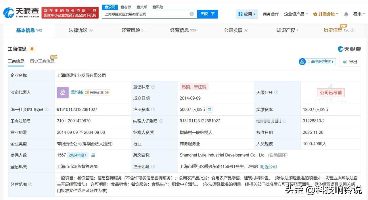 【上海绿捷被列入黑名单 上海绿捷被吊销执照 上海绿捷成严重违法失信企业】 天眼查工商信息显示,近日,上海绿捷实业发展有限公司因拒绝、阻碍、干扰市场监督管理部门依法开展监督检查和事故调查,被上海市市场监督管理局列入严重违法失信企业名单(黑名单),同时被吊销营业执照、许可证。 该公司成立于2014年9月,法定代表人为葛均锋,注册资本5000万人民币,经营范围包括餐饮管理、信息咨询服务、食用农产品批发等,由GreenExpress Foods, Limited全资持股。 据媒体报道,11月14日,上海市市场监督管理局发布绿捷食安事件情况通报称,已查明事件经过和绿捷公司及相关人员违法犯罪事实,拟依照法定程序吊销绿捷公司的食品经营许可证及营业执照,公司实际控制人张某华等8名责任人已被依法执行逮捕。 天眼查信息: