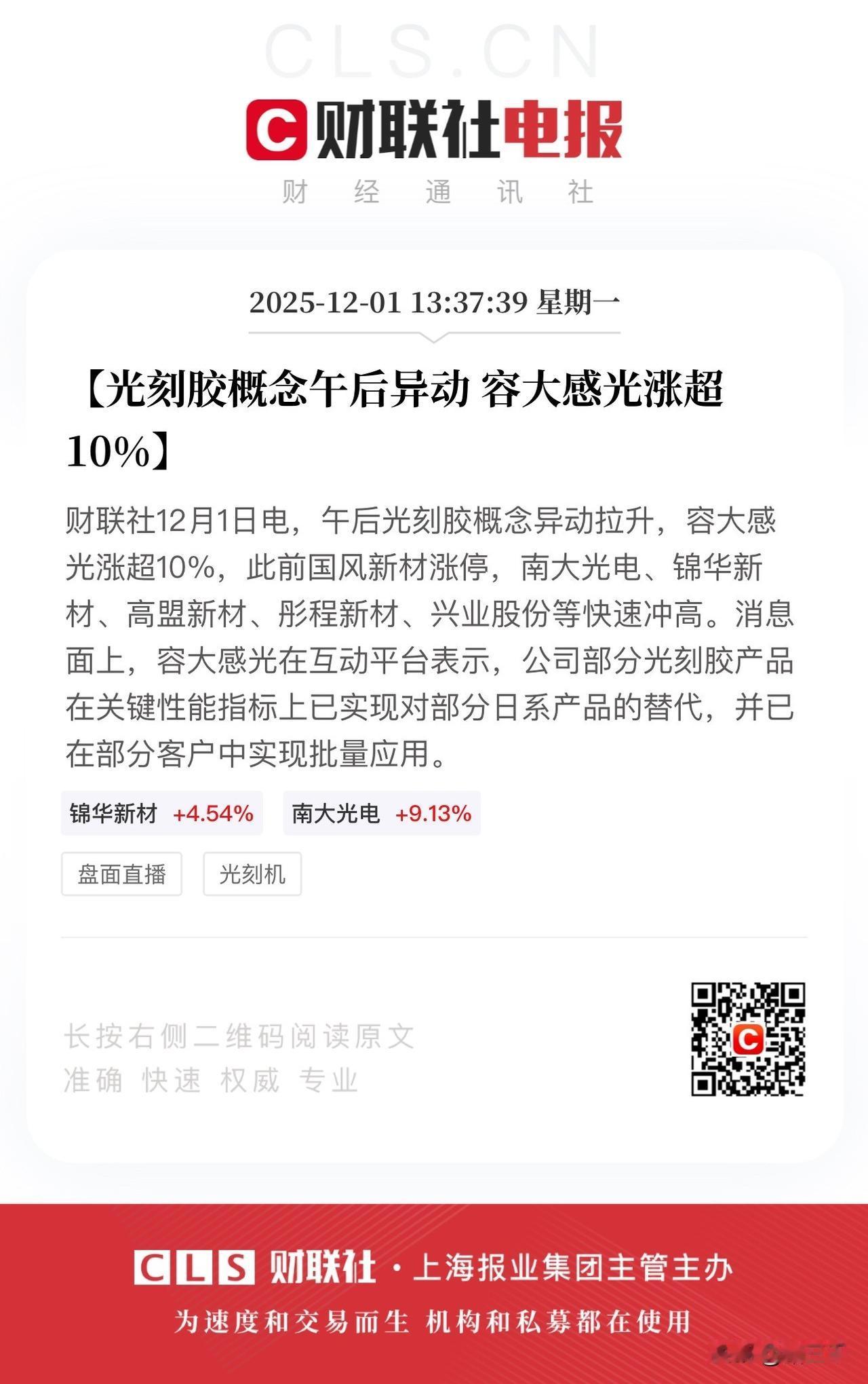 下午盘面越走越强, 无奈热点太多火力不够集中! 下午资金拉升了光刻胶: 晶瑞电材、容大感光均有表现; 流感概念特一药业、海王生物凑热闹! 存储芯片资金挖掘北京君正, 但板块和锂电池一样冲高回落。 鼓励风光锂储出海, 政策预期空间打开。 既然走轮动那么就认准主线不动摇, 跳来跳去并不能赚到钱, 这个阶段瞄准低位补涨逻辑更好, 科技高标观察下来还是犹豫居多, 比如CPO、PCB这些除了短线快进快出, 你拿在手上心里没底…