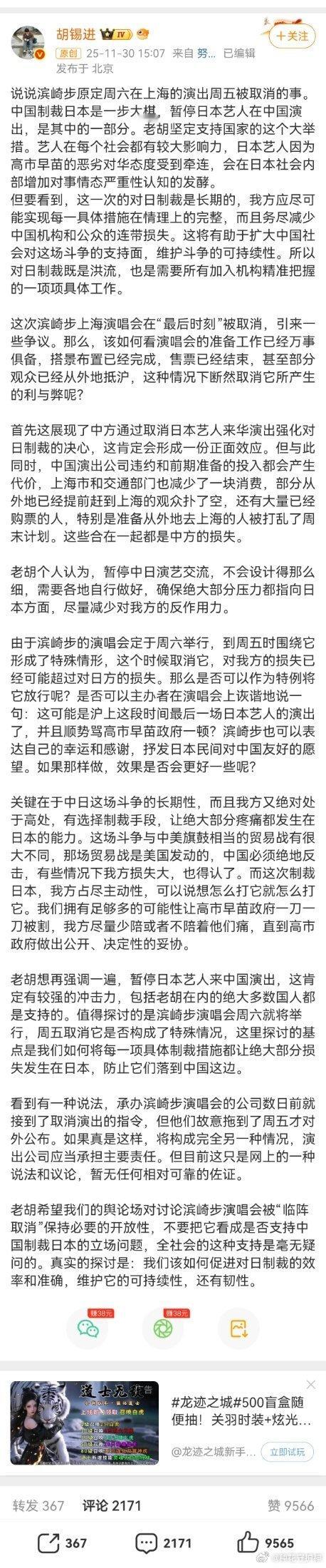 哎呀胡锡进,为滨崎步说话。强调,我方应尽可能实现每一具体措施在情理上的完整,而且务尽减少中国机构和公众的连带损失。要求,也是需要所有加入机构精准把握的一项项具体工作。提到,上海。指出,这种情况下断然取消它所产生的利与弊呢?强调,中国演出公司违约和前期准备的投入都会产生代价,上海市和交通部门也减少了一块消费。要求,那么是否可以作为特例将它放行呢?抒发日本民间对中国友好的愿望。要求!老胡希望我们的舆论场对讨论滨崎步演唱会被“临阵取消”保持必要的开放性。