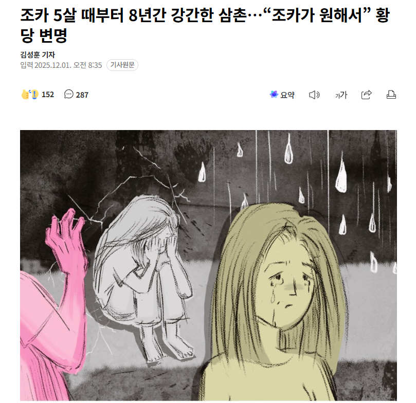 【韩国男子性侵年幼外甥女长达8年,荒唐辩解称“是外甥女自己愿意的”】海外新鲜事热点现场 韩国一名性侵5岁外甥女长达8年的男性被判处有期徒刑。据法律界1日消息,议政府地方法院南杨州分院第1刑事庭近期对因违反《关于性暴力犯罪处罚等特例法》等嫌疑被移交审判的A某,判处有期徒刑15年,并命令其完成80小时的性暴力治疗课程。A某因涉嫌从外甥女B某年满5岁的2016年开始,到去年6月为止,在约8年时间里对其进行习惯性地性侵而被起诉。调查显示,A某作为B某的实际监护人,利用其优势地位长期持续犯罪。他在罪行暴露后,甚至辩称“是外甥女自己愿意,我只是帮忙”,完全没有表现出反省的态度。金庭长法官指出:“被告人将连性行为意义都不懂的外甥女作为性发泄的手段”,“犯罪性质极其恶劣,罪责深重。” 同时表示:“受害者至今仍承受着相当大的精神痛苦,这种受害经历很可能对其健康成长和形成健康的性价值观产生负面影响”,“对被告人必须予以与其罪责相适应的严厉惩罚,这一点不可避免。”