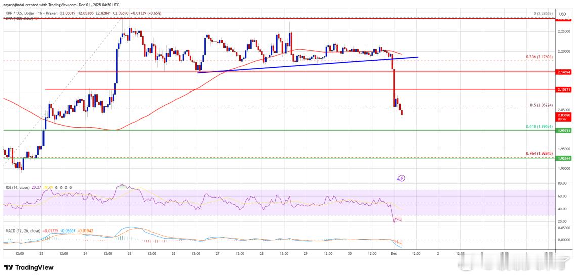 XRP 跌破 2.150 美元,开启新一轮下跌,目前在 2.10 美元附近受阻。小时图显示跌破关键上升趋势线和多条支撑位,短期看跌信号明显。如果未能突破 2.10 美元阻力,下行初步支撑在 2.00 美元,主要支撑在 1.9250 美元,跌破可能进一步下探至 1.850-1.80 美元。反之,站稳 2.10 美元,价格有望回升至 2.120-2.250 美元。短期多空仍在博弈,关注关键价位。区块链山寨币