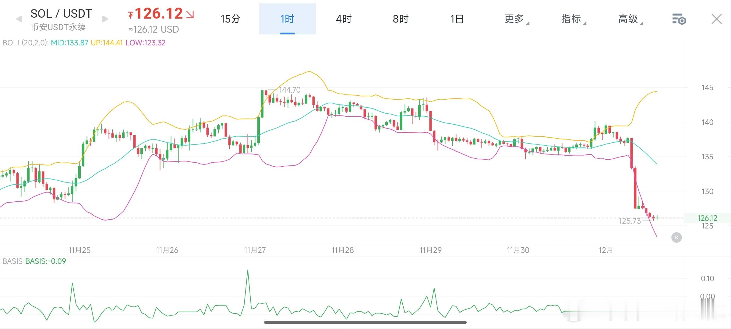 12.1午间思路SOL 盘整格局打破,价格维持布林下轨弱势运行,空头占据主导,后市操作高空不变!sol 可反弹128-131附近空,下看121-115-110