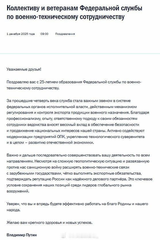 瓦洛佳小朋友 弗拉基米尔·普京向俄罗斯联邦军事技术合作局全体工作人员和老兵表示祝贺,祝贺该机构成立25周年。总统指出,尽管俄罗斯遭受了制裁,但仍必须扩大与外国的军事技术联系。