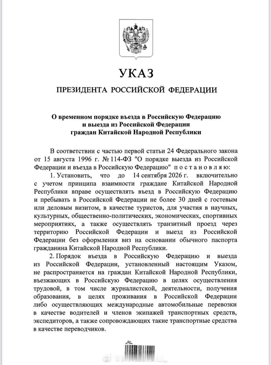 瓦洛佳小朋友 中国公民可免签入境俄罗斯,停留期限最长为30天。普京签署了相关法令。该政策将持续实施至2026年9月14日。