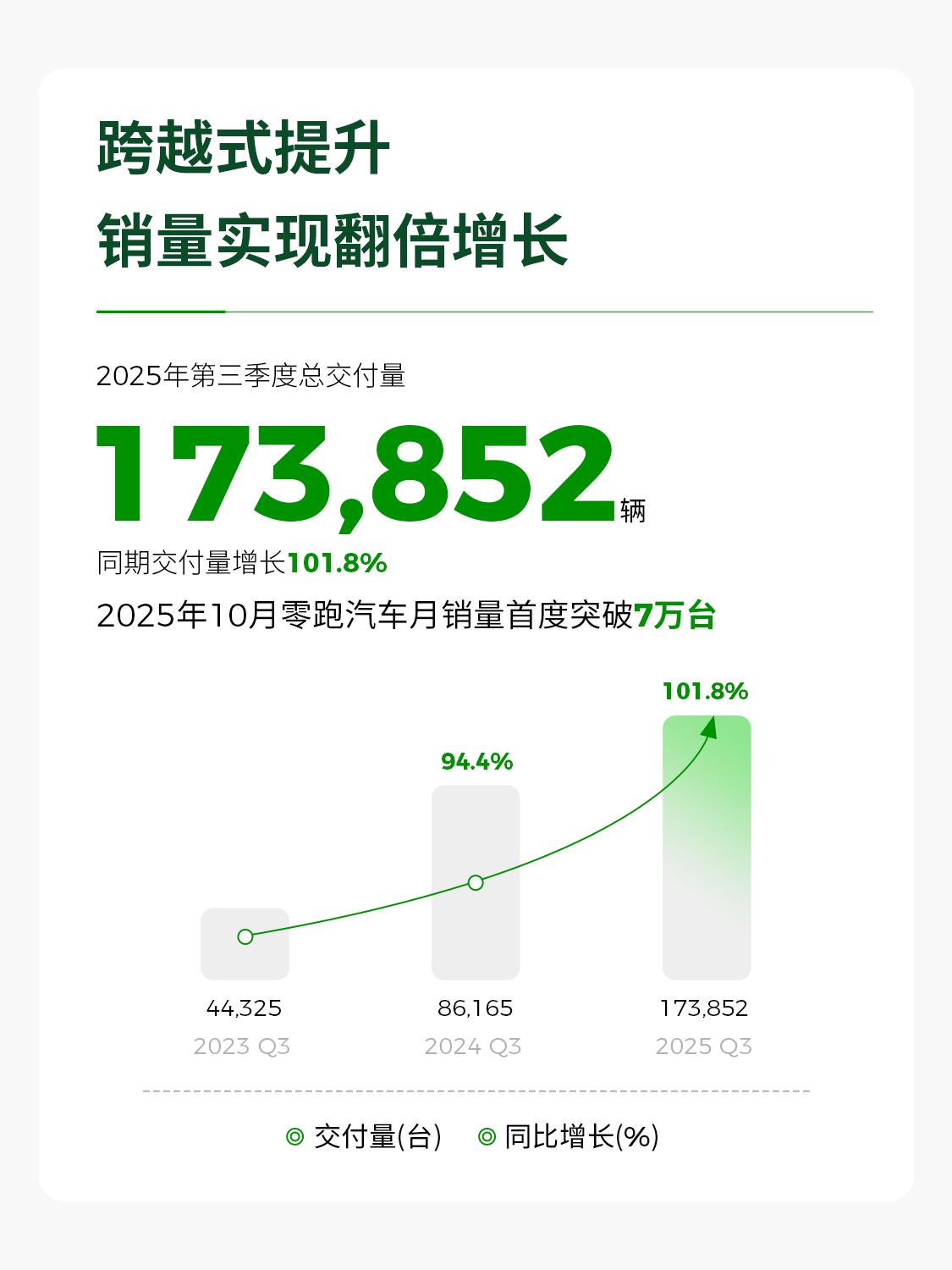 零跑月交付量又达7万+,这丝毫不给友商追赶的机会啊? 零跑今年的销量表现我想不用多说吧?就在11月,零跑又交付了70327台,延续了零跑今年的强势表现。并且零跑出口量和海外订单量都创下了新高你敢信?11月零跑出口9348台,订单1.5万+,并且在意大利市场、德国市场表现出色,不得不让人佩服。零跑凭借这一销量,不仅实现了连续9个月蝉联新势力月销第一,而且全年销量也有望超过60万台。 更值得关注的是前几天零跑发布的三季度财报。根据财报数据显示,零跑在三季度累计交付17万多台,同比大增101.8%;营收达到了194.5亿,同比增长97.3;关键的净利润方面,零跑实现持续季度盈利,净利润为1.5亿。作为对比,零跑是蔚来、小鹏、理想、零跑这四大新势力中唯一一家实现三季度盈利的品牌,由此可见零跑汽车的发展多么强势。也正是由于零跑的出色财务表现,零跑还在近日被纳入了恒生科技指数成份股,成为继小米、理想、小鹏等科技型主机厂之后又一家入选车企。 与此同时,零跑在产品端也持续布局,近日Lafa5正式上市,A10、D19也都已亮相,意味着零跑在产品方面已经完成了ABCD系列的完善布局。 可以说在零跑即将迎来品牌成立十周年之际,已经在市场、资本、产品层面都取得了出色成绩,这将助力零跑明年冲击百万年销目标。零跑汽车零跑Lafa5 小鹏 理想