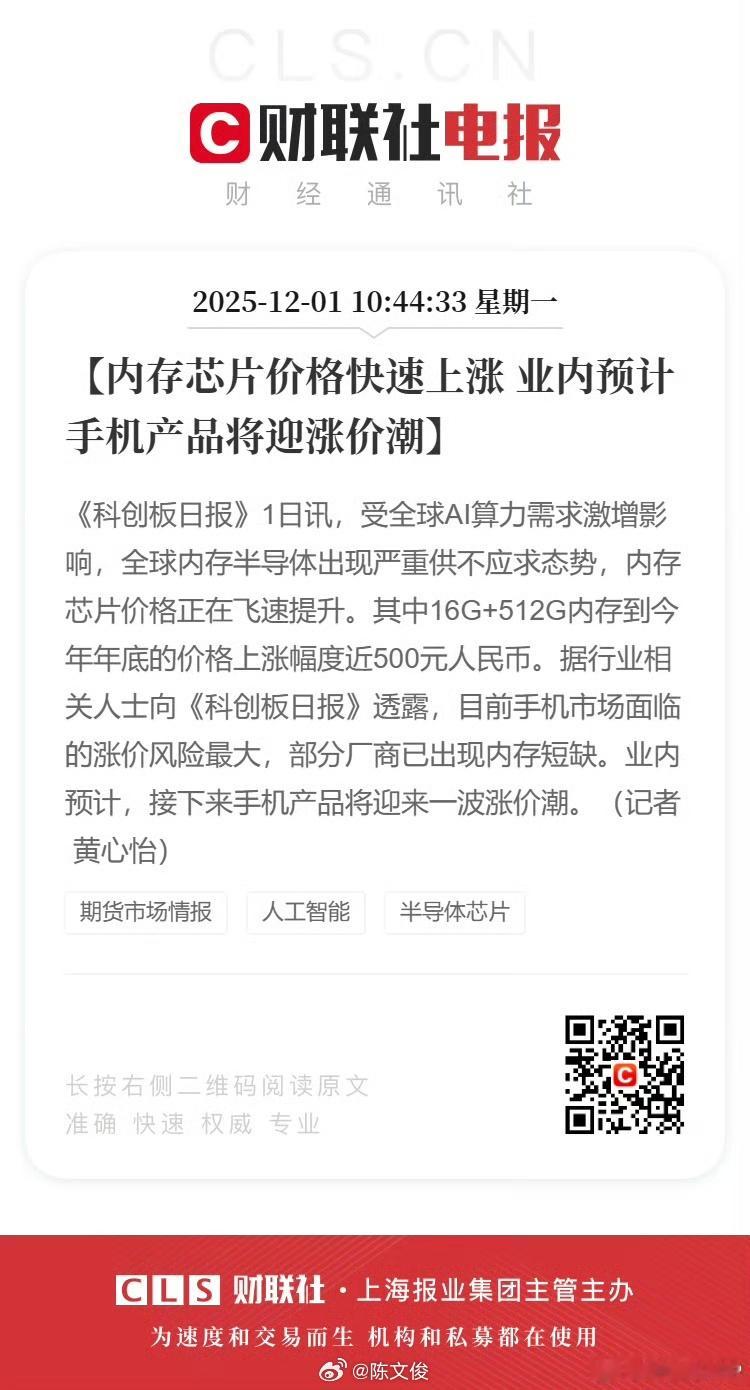 小至手机、电脑、智能家电,大到汽车、设备、产线都要用到内存,牵一发而动全身,内存资源越来越贵,短期内很难下降,只能靠市场慢慢消化理解了。内存芯片价格大涨业内预计手机将迎涨价潮