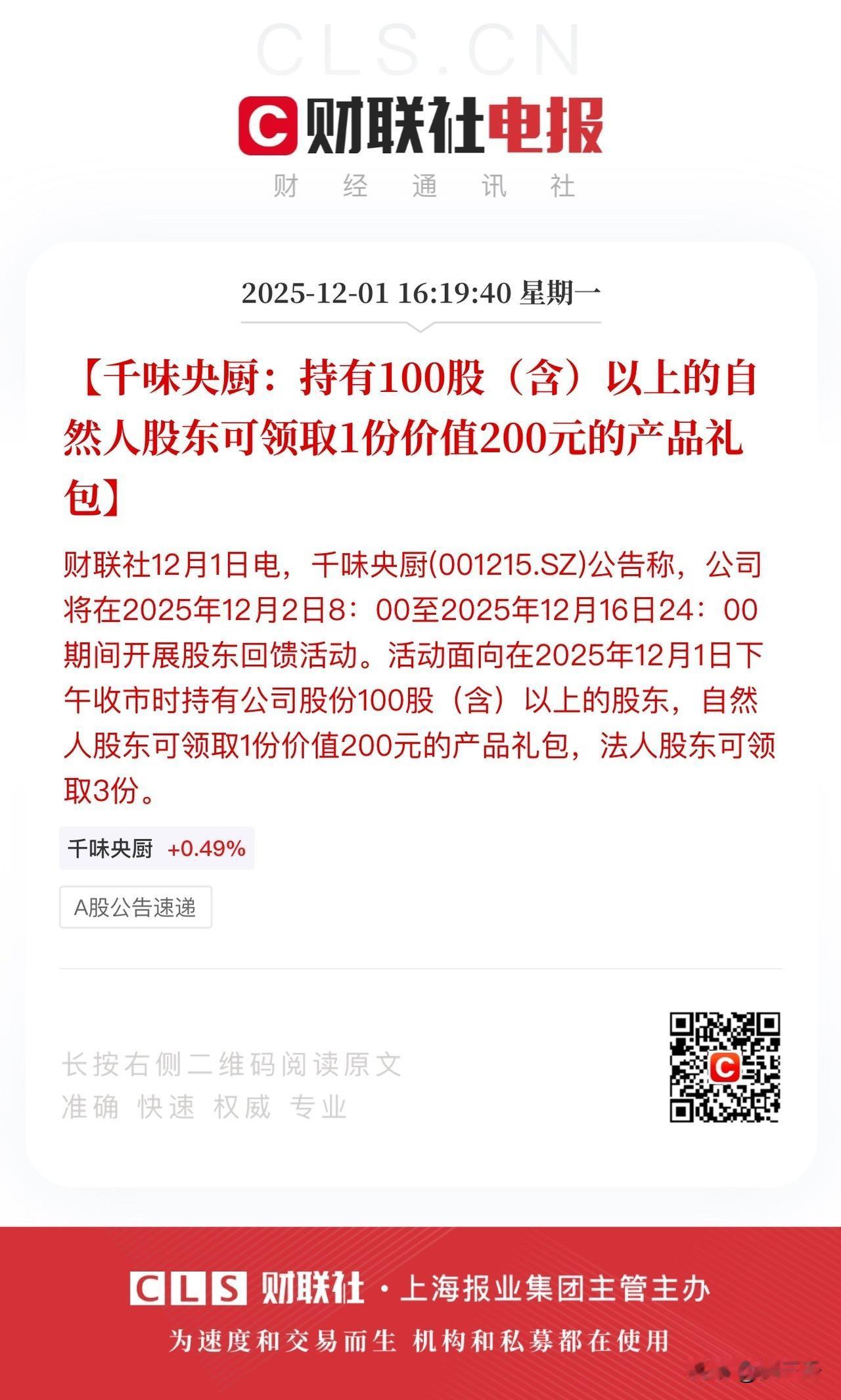 峨眉山效应开始溢出: 千味央厨发公告持有100股及以上的自然人股东可领取1份价值200元的产品礼包,法人股东可领取3份。 促消费需要好点子, 好点子是可以复制的。 看似峨眉山免门票吃亏, 关键带来的客流量和周边消费不可估量。 而且精准筛选消费人群, 但凡能炒股的大都追求小资生活, 去一趟酒店住一住、美食吃一吃、项目玩一玩, 好比村超、哈尔滨中央大街, 这是筑巢引凤…