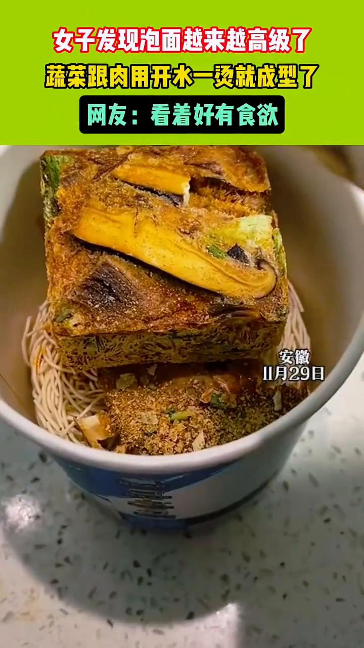 女子发现泡面越来越高级了,蔬菜跟肉用开水一烫就成型了。 网友:看着好有食欲。 11月29日,安徽宿州。