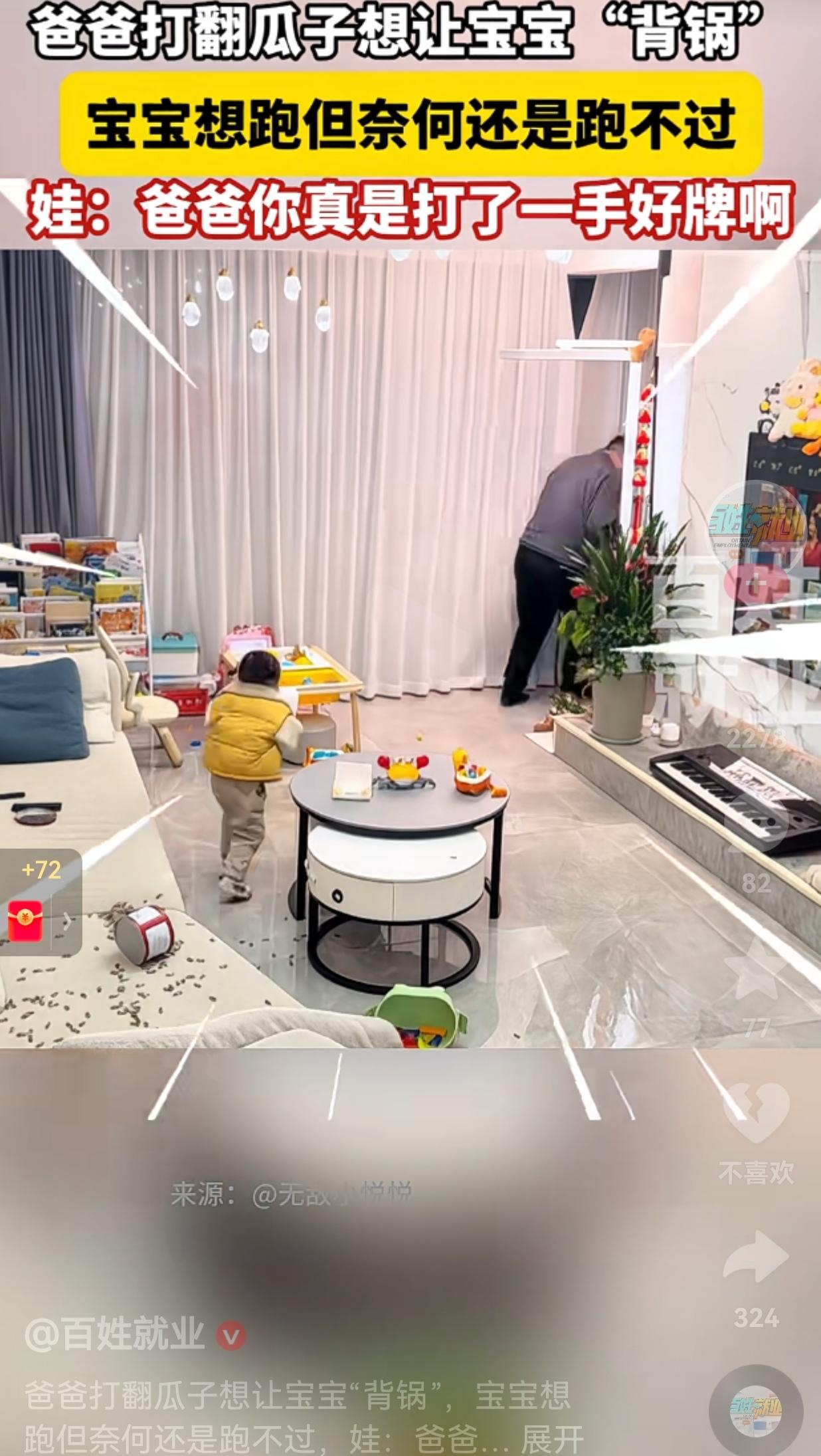 真的是坑娃!近日,江苏一男子不小心打翻了身旁的瓜子,意识到闯祸的男子,不仅没有想到施救,反而将萌娃抱在了案发现场让萌娃给自己背锅。 萌娃看到爸爸走向自己的那一刻,萌娃大喊一声,拼了命地往前逃跑。可惜的是,由于萌娃太小了,根本跑不过爸爸。才跑了几步远,就被爸爸一把抱了回来。 接着,爸爸赶紧逃离了案发现场等妻子发现满地的瓜子,不由得大声惊叹!怎么回事?地上怎么这么多瓜子呢?再一看现场只有萌娃一个人,就知道肯定是萌娃所为。 男子听到妻子的说话声,这才若无其事地走了出来。 令人不可思议的是,为了摆脱自己的嫌疑,男子的手里竟然拿着衣服,还跟妻子说:“我就弄个衣服的时间,没想到就发生了这件事情。” 最后,妻子信以为真,将孩子抱了起来,还在萌娃的耳边说:你下次不要这么调皮了,好不好? 男子知道自己已经逃脱了嫌疑,这才“长叹一口气。” 网友看到后评论说,你看萌娃拼了命地逃离的样子,看得出来,萌娃不是第一次被爸爸套路了! 还有的网友说,萌娃是吃了不会说话的亏,但凡会讲话,也不至于被老爸这么陷害呀! 这件事看似是“搞笑坑娃”的家庭趣事,实则藏着亲子教育中“责任与信任”的漏洞——爸爸用“甩锅”的方式逃避自己的过失,不仅消耗了孩子的安全感,更错过了教会孩子“勇于担当”的重要契机。 当然,这大概率是爸爸故意的玩笑,但亲子间的“玩笑”也该有边界——不能以牺牲孩子的信任、让孩子受委屈为代价。真正的家庭互动,应该是爸爸主动承认“是我打翻的,我们一起收拾”,既教会孩子直面错误,也能让孩子感受到公平与尊重,这才是玩笑之外更重要的教育意义。 大家觉得呢?欢迎大家评论区讨论留言。