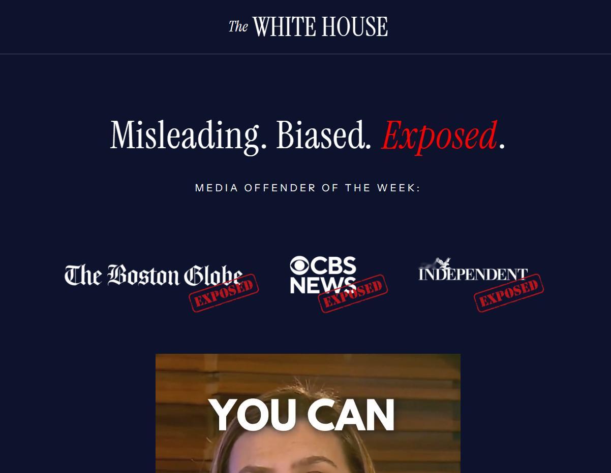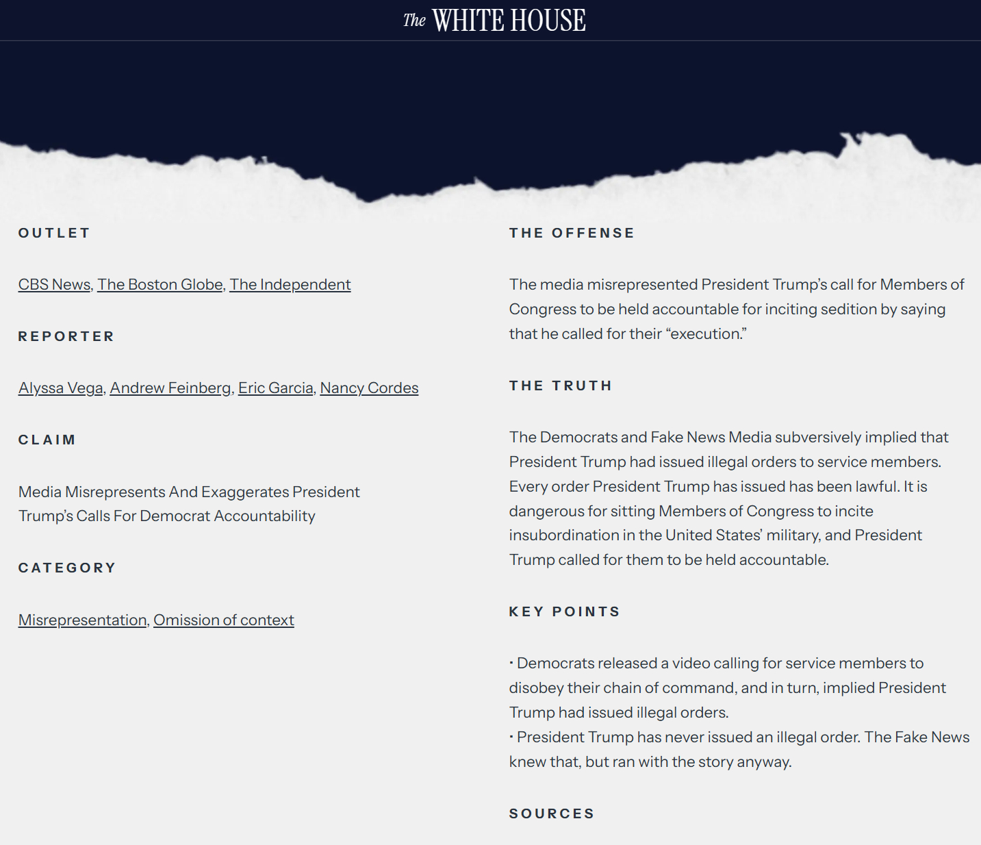牛啊,又开眼了。美国白宫周五在官方网站上线新专区——“媒体违规者(Media Offender)”,并设置“黑名单”与“每周耻辱排行榜(Offender Hall of Shame)”,公示“扭曲报导”的媒体、记者与相关报导。该页面上部写着:“误导,偏见,揭露”。页面还设置了“耻辱每周排行榜”,目前上榜的有《华盛顿邮报》、《哥伦比亚广播公司新闻网》、CNN等。访客可搜索文章存档,并看到记者姓名。每篇报导皆被贴上“偏颇”、“失职”、“左翼疯狂”等标签。本周被点名为“媒体违规者”的包括《波士顿环球报》、CBS新闻与《独立报》。这些媒体报导了一段由六名民主党议员发布的视频。六名议员均为军人或情报官员背景,他们在视频中提醒军人“拒绝服从非法的命令”。白宫在页面上声明:“民主党与假新闻媒体暗示阿川总统向军人下达非法命令。阿川总统发布的每一道命令皆合法。国会议员煽动美军抗命极其危险,总统呼吁应追究其责。”
