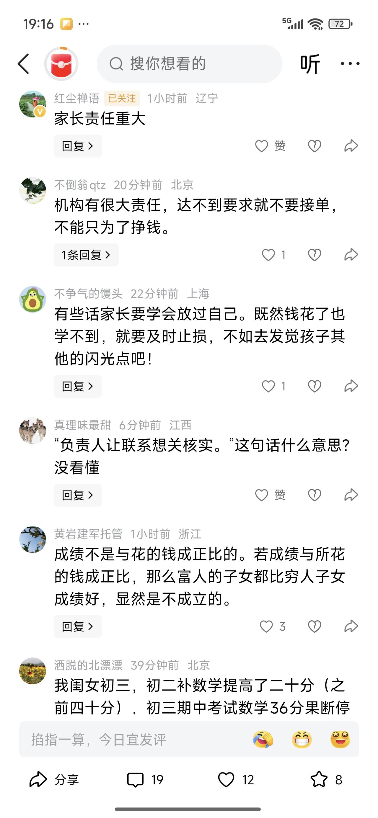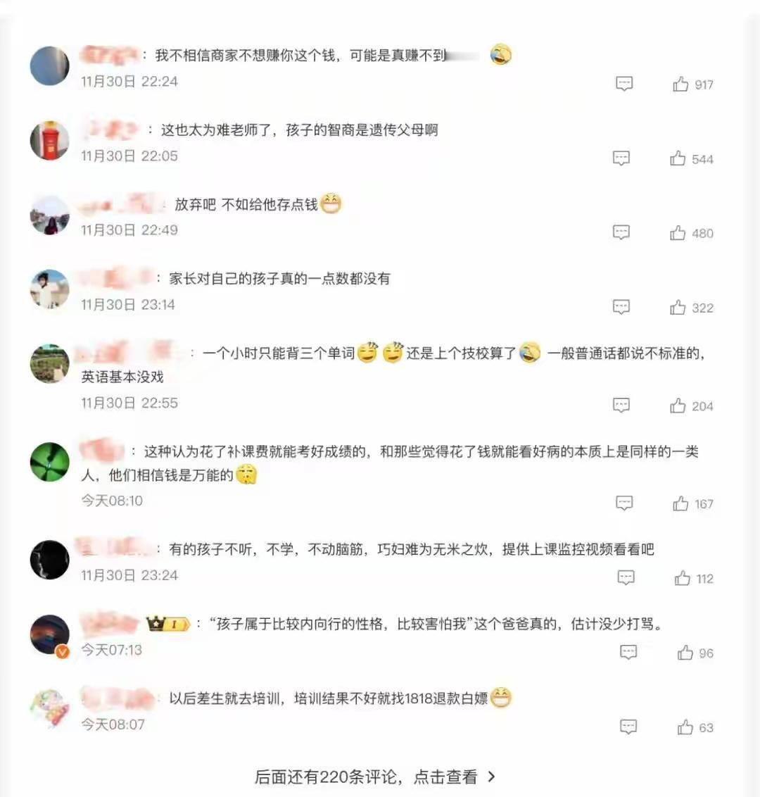 杭州一男子花两万七给孩子补课,承诺的80分孩子没有考到。两门都不及格。家长要求退款。 退款不退款咱先不说。你这钱算是花冤枉了!你不如给他交几年养老保险,等他工作了,自己再交几年就退休了!真的这钱丢水里不响。 到时候比别人早退休好几年。你说有道理没,他学习,也是为了工作。工作也是为了挣钱,挣钱都想交个保险,等待退休。殊途同归,你怕啥。 你看现在,那些有养老的人,活的多快乐!补课 你种个地瓜,能收获个土豆吗?说白了,你种不好,要么地不好?不信你问问,那些学霸,有几个是补课补出来的?天生就不是那块料,开发开发别的项目吧!平安长大,其实真挺难的。认头吧!嘿哈
