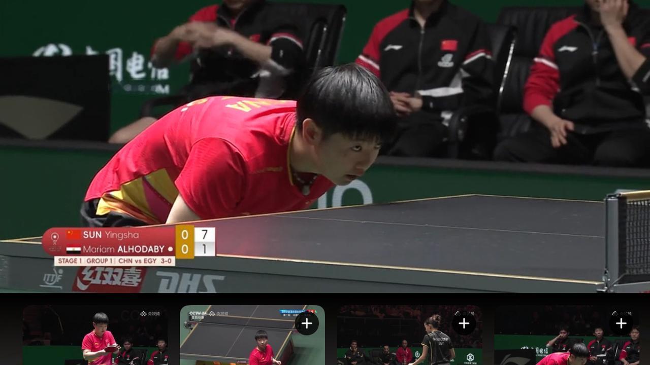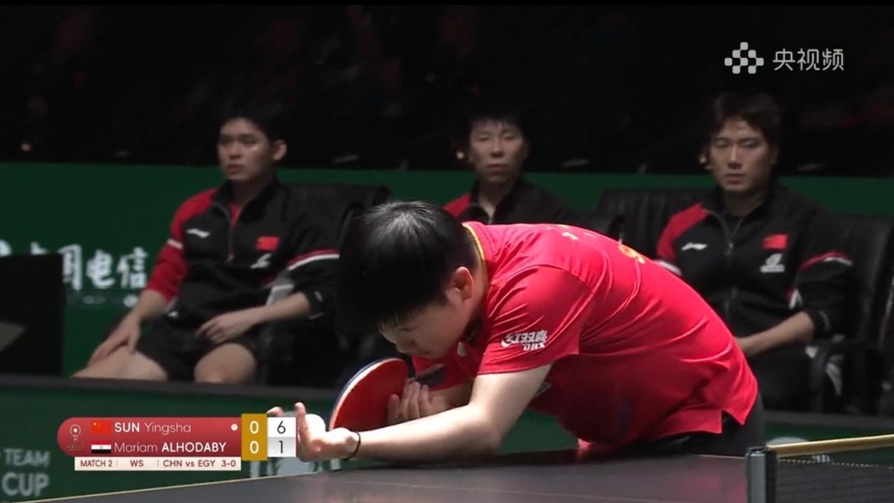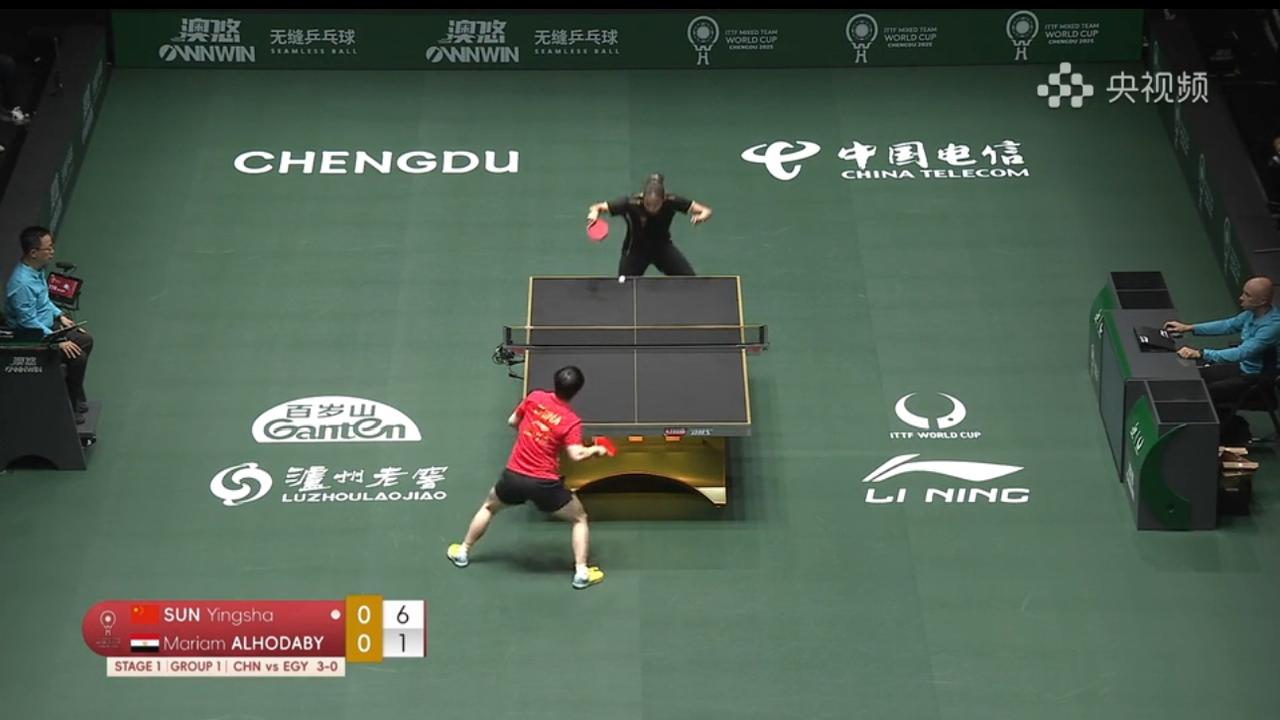 国际乒联混合团体世界杯中国🇨🇳🆚埃及🇪🇬。 忙完了一天的琐事,19:00准时守在电视机前,只为蹲一场国乒的比赛,观看今晚国际乒联混合团体世界杯中国🇨🇳🆚埃及🇪🇬。 虽然明知道实力悬殊,中国稳赢,但是还是想看莎莎打球🏓,现在能让我开电视机的也只有她了。 刚刚结束的混双林诗栋/蒯曼3-0已经拿下了第一盘;第二盘莎莎3-0胜出:在对战的时候,莎莎第一局轻松拿下,第二局差点浪丢了,比分打到14-12,第三局也是轻松拿捏🤏🏻。 目前中国队🇨🇳大比分6-0领先。 (视频截图)