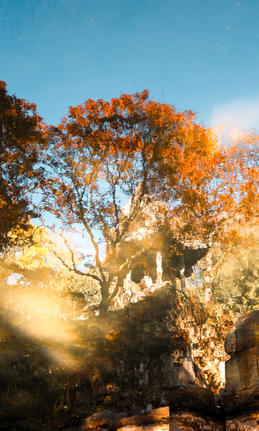 银杏鎏金枫染彤,层林织锦势如虹。清波潋滟盈秋色,五彩斑斓仙境中。