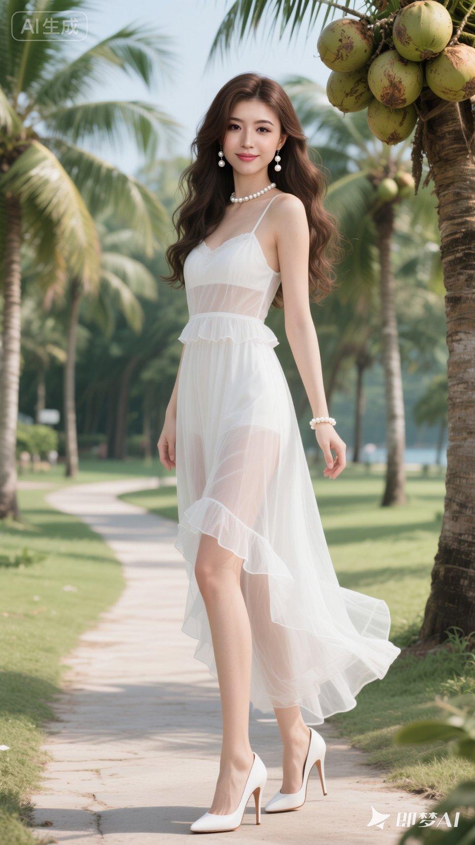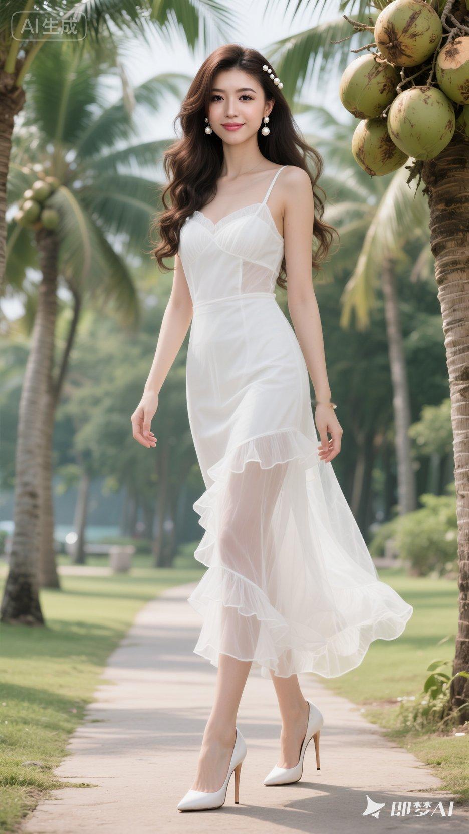 一位现代女子,身高172,温柔有气质,肤白貌美大长腿,凹凸有致,26岁,高冷御姐脸,眼睛很美,妆容精致。 女生留着黑棕色长卷发,白色薄纱吊带荷叶长裙,头发有珍珠修饰,戴着珍珠耳环和手链,白色12厘米尖头细高跟鞋,站在公园椰树小道上,摇曳生姿,美艳不可方物
