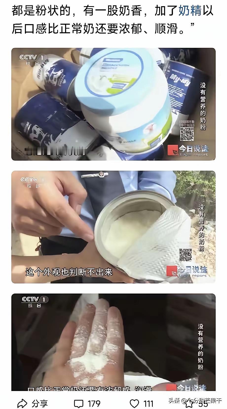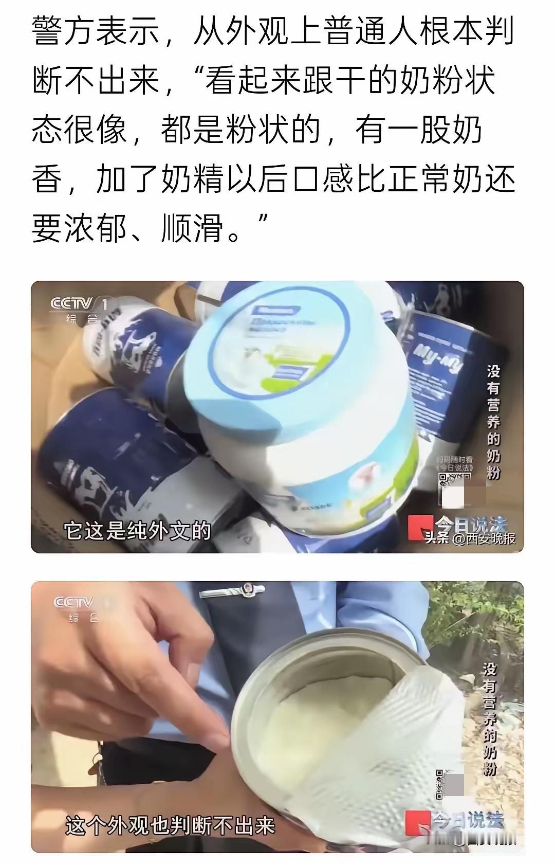 看到假奶粉的新闻后,我感觉就像吃了个苍蝇。以前都是给老妈买盒装牛奶的,后来听说进口奶粉好,奶源好,品质高。想着奶粉确实挺方便,每天挖几勺冲冲水就可以了。 今年就开始给老妈买进口奶粉,喜滋滋的认为是给老妈提高了生活品质。 万万没想到央视爆出了假奶粉黑作坊,用植脂末和淀粉香精生产出蛋白质和脂肪含量几乎为零的奶粉,冒充14种不同品牌的进口奶粉进行罐装,通过各大电商平台卖出去。 据说这种假奶粉成本只有4块,销售价能达到88块,简直是让人想都不敢想。 想起几十年前的三鹿假奶粉事件,几乎害了一代人。那时候严抓严打了,怎么现在又冒出来了。 黑心老板被抓后还嘴硬,说虽然没营养,但至少没毒。这是有多不要脸啊!这种人抓住就应该牢底坐穿,省得过了多少年又出来传帮带。