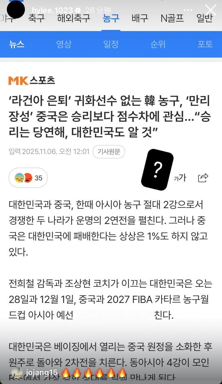 赛后,韩国球员李贤重社媒转发了一则关于韩网预测世预赛中国男篮对阵韩国男篮的新闻。